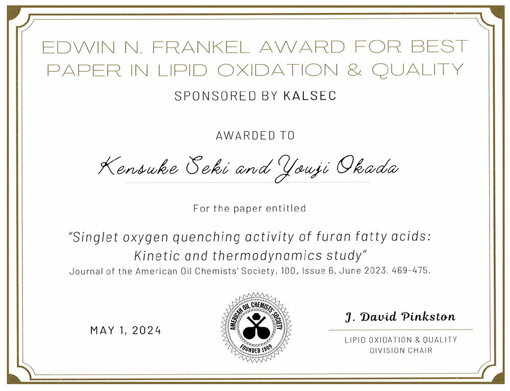 今回の受賞は、2023年にJournal of the American Oil Chemists’ Societyに投稿・発行された”Singlet oxygen quenching activity of furan fatty acids: Kinetic and thermodynamics study”に対するもので、活性酸素種の一種である一重項酸素に対するフラン脂肪酸の捕捉効果を熱力学的に検討したことが評価されました。なお、受賞の記念として記念額と証明書が贈呈されました。