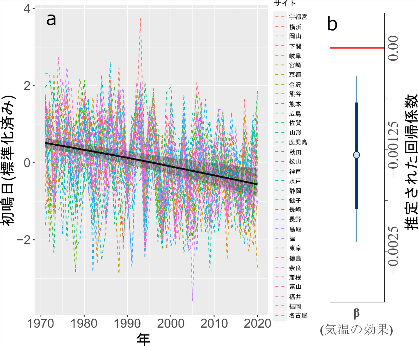 長期的なデータを見ると、盛夏から初冬の気温のデータは上昇傾向、アブラゼミの初鳴き日は早まる傾向にあります。これらの関係性から、時系列トレンドを持ったデータ同士の関係を評価する統計手法である「状態空間モデル」を作成して分析したところ、アブラゼミの初鳴き日の早期化は、気温の経年的な上昇(温暖化)の影響であるという仮説が支持されました(図3)。