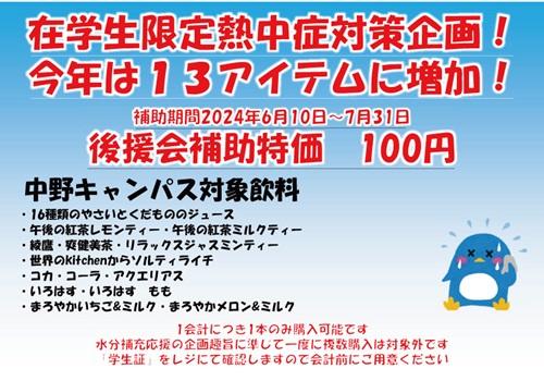 この取り組みは、本学後援会の支援を受け、学生の健康と安全を守るために実現されたもの。熱中症は、過酷な暑さにさらされると発症する重大な健康問題で、適切な水分補給や休息が必要不可欠である。特に暑さが厳しいこれからの時期に学生が健康に学び続けられるよう、対象飲料を特別価格の100円で提供し、適切な水分補給を促す。対象飲料は10種類以上あり、その日の気温や体調に合わせて、学生たちが自由に飲料を選べる。