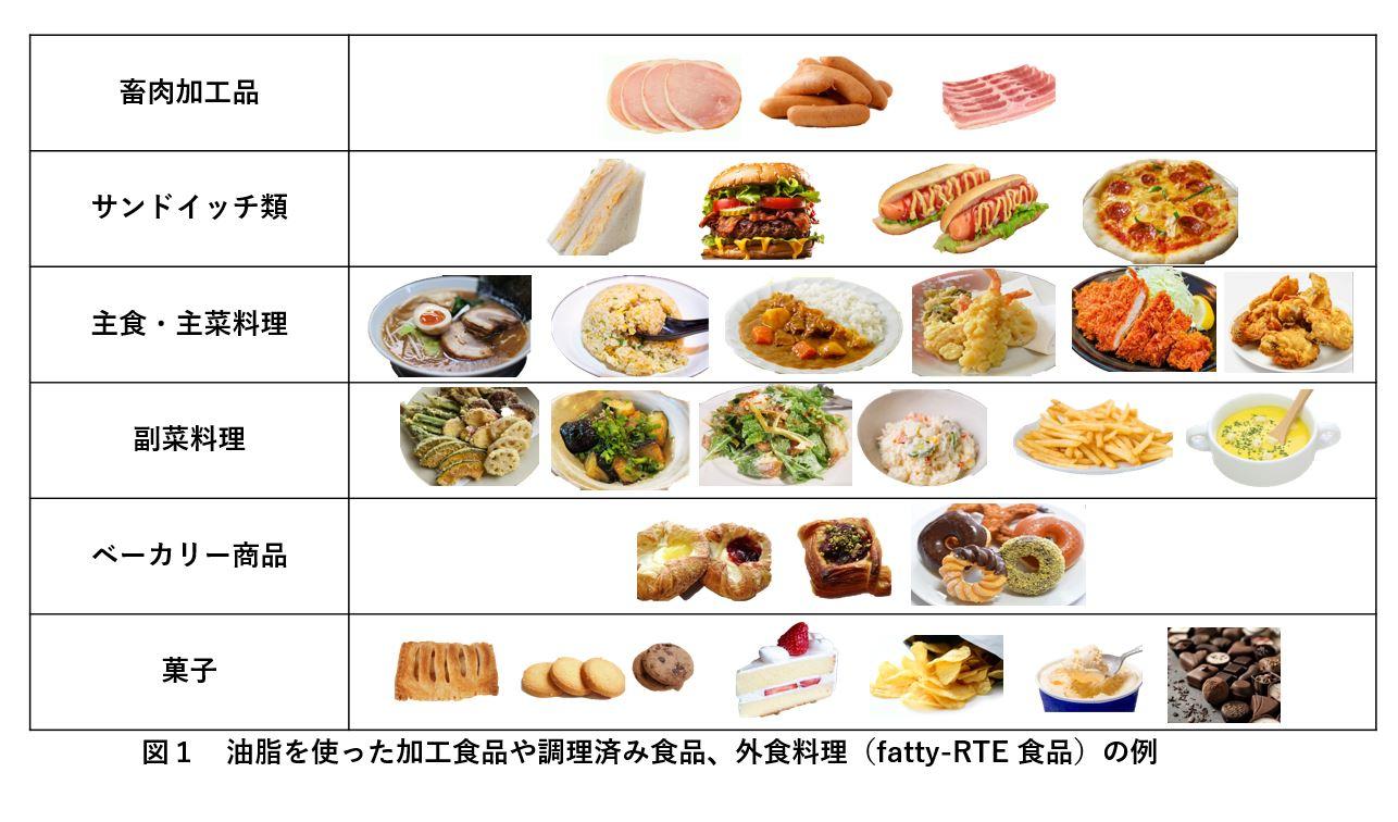 我々は2016~2018年に首都圏在住20~50歳の213人(男性109人、女性104人)に研究参加を依頼し、食事調査と身体計測、血圧測定、空腹時採血を行い、洋食パターンの食事を食べている人で脂肪肝指標が高いことを明らかにしていました。本研究では、食事調査の結果を再解析して、加工食品のうち、RTE食品を油脂の使用の有無で分け、fatty-RTE食品(図1)由来エネルギー摂取量の総エネルギー摂取量に占める割合を算出しました。参加者全体の中央値で、総エネルギーの63%を加工食品から、36%をfatty-RTE食品から摂取しており、加工食品に依存した食生活であることが明らかとなりました。