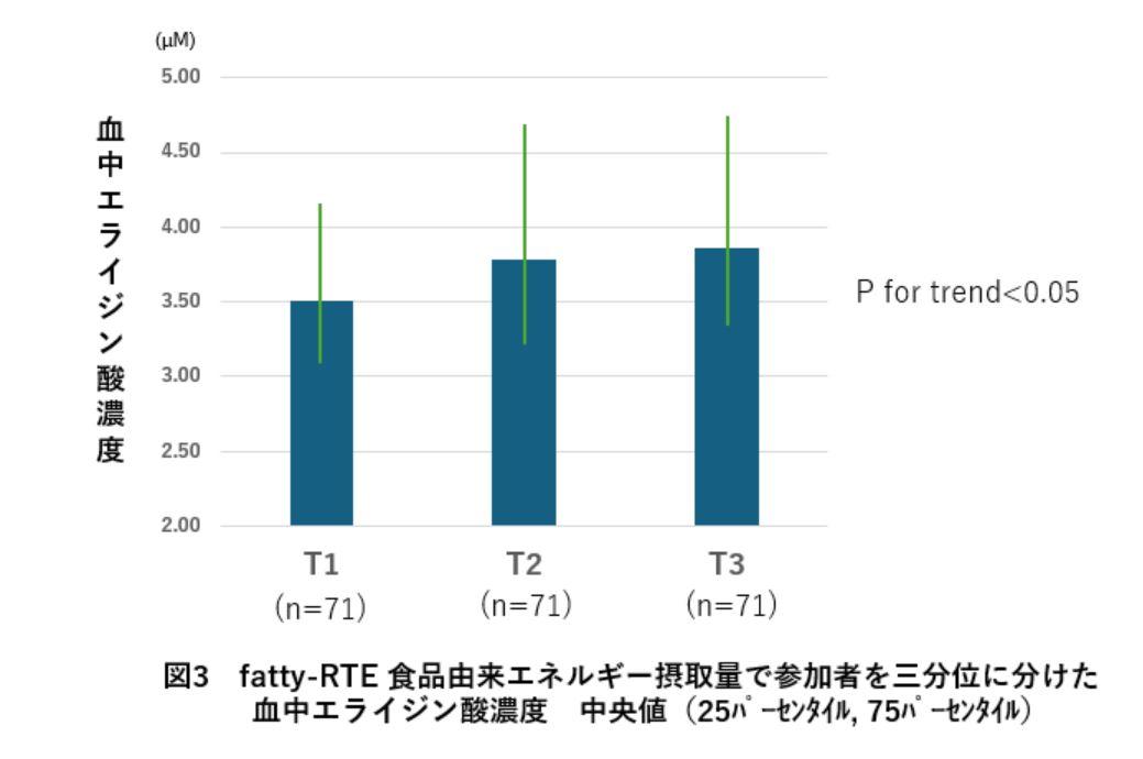 血中の主なトランス脂肪酸であるエライジン酸(工業由来)とバクセン酸(天然由来)濃度を共同研究者の篠原正和教授(神戸大学)が測定し、予想通りfatty-RTE食品の摂取が多いと、がんや動脈硬化のリスクを高めると言われているエライジン酸濃度が高い(図3)ことが分かりました。