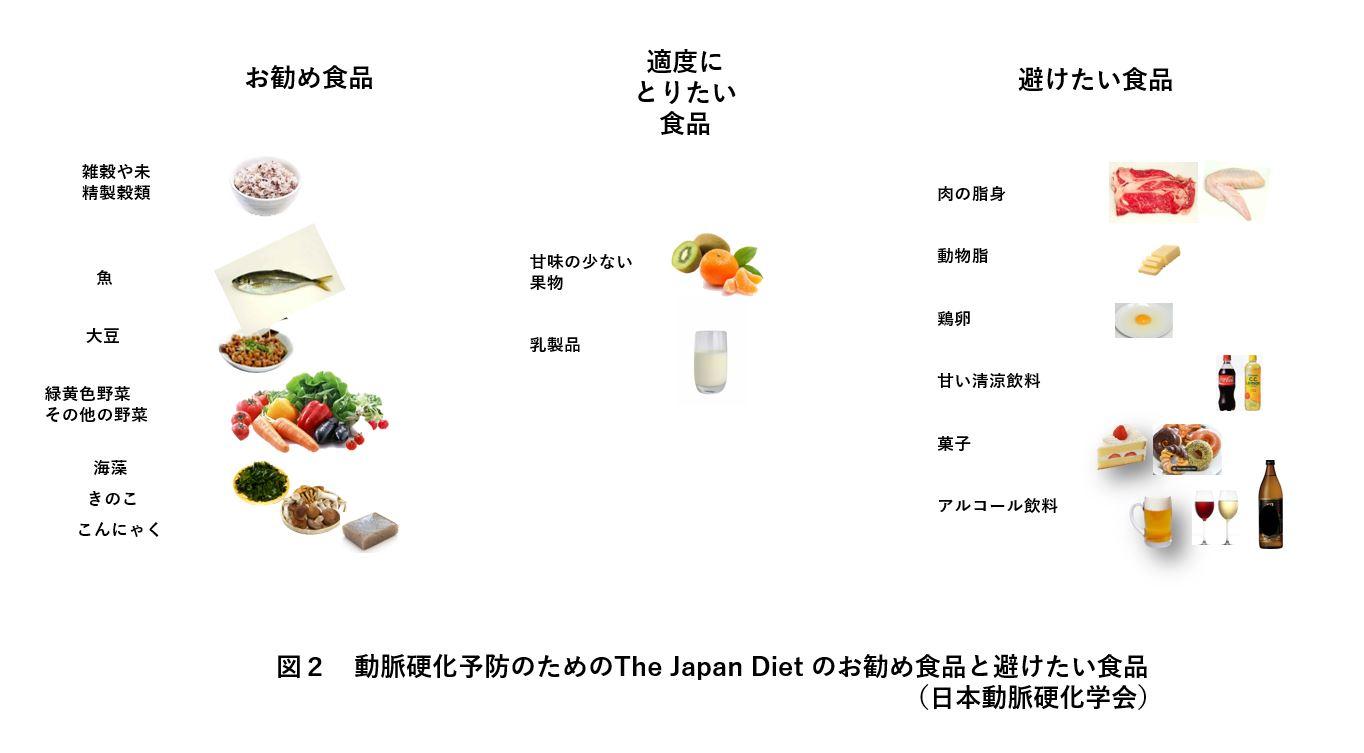 *2 The Japan Diet:日本動脈硬化学会が推奨する動脈硬化予防に役立つ食様式です。①肉の脂身、動物脂、鶏卵、清涼飲料や菓子などの砂糖や果糖を多く含む加工食品、アルコール飲料を控え、②魚、大豆・大豆製品、緑黄色野菜を含めた野菜、海藻・きのこ・こんにゃく、未精製穀類や雑穀を積極的にとり、③精製した穀類を減らして、未精製穀類や雑穀・麦を増やし、④甘味の少ない果物と乳製品を適度にとるように食材を取り揃え、⑤減塩して薄味で食べます。