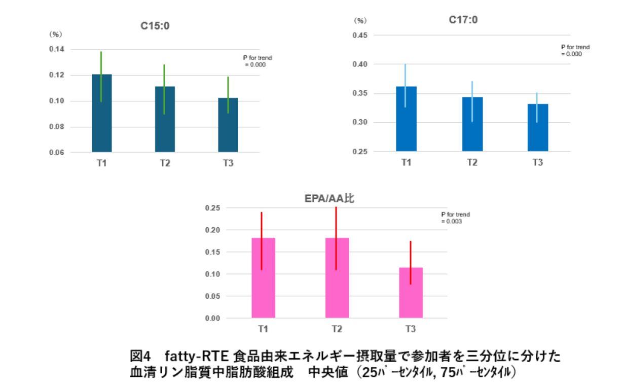 本学で血清からリン脂質を抽出してガスクロマトグラフィーで脂肪酸濃度を測定すると、fatty-RTE食品の摂取が多いとEPA・DHAが少なく、動脈硬化の予測指標と言われているEPA/AA比*8が低い結果が得られました。最近、食物繊維は腸内細菌でプロピオン酸の産生を高め、肝臓で奇数酸のC15:0とC17:0を増やすことで脂肪酸合成を調整することが明らかにされています。我々はメタボリックシンドローム患者や脂質異常症患者で血中C15:0とC17:0の濃度が低いことを明らかにしていました。今回の研究でfatty-RTE食品の摂取が多いと血中C15:0とC17:0の濃度が低かったことから(図4)、食物繊維摂取不足の影響が確認できました。