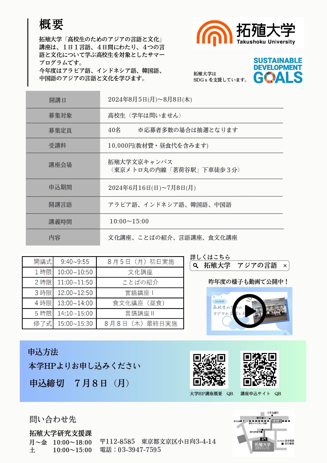 【拓殖大学】高大連携講座「第18回 高校生のためのアジアの言語と文化」を開催 。4カ国の言語・文化・食を学ぶサマープログラム。参加者募集中。