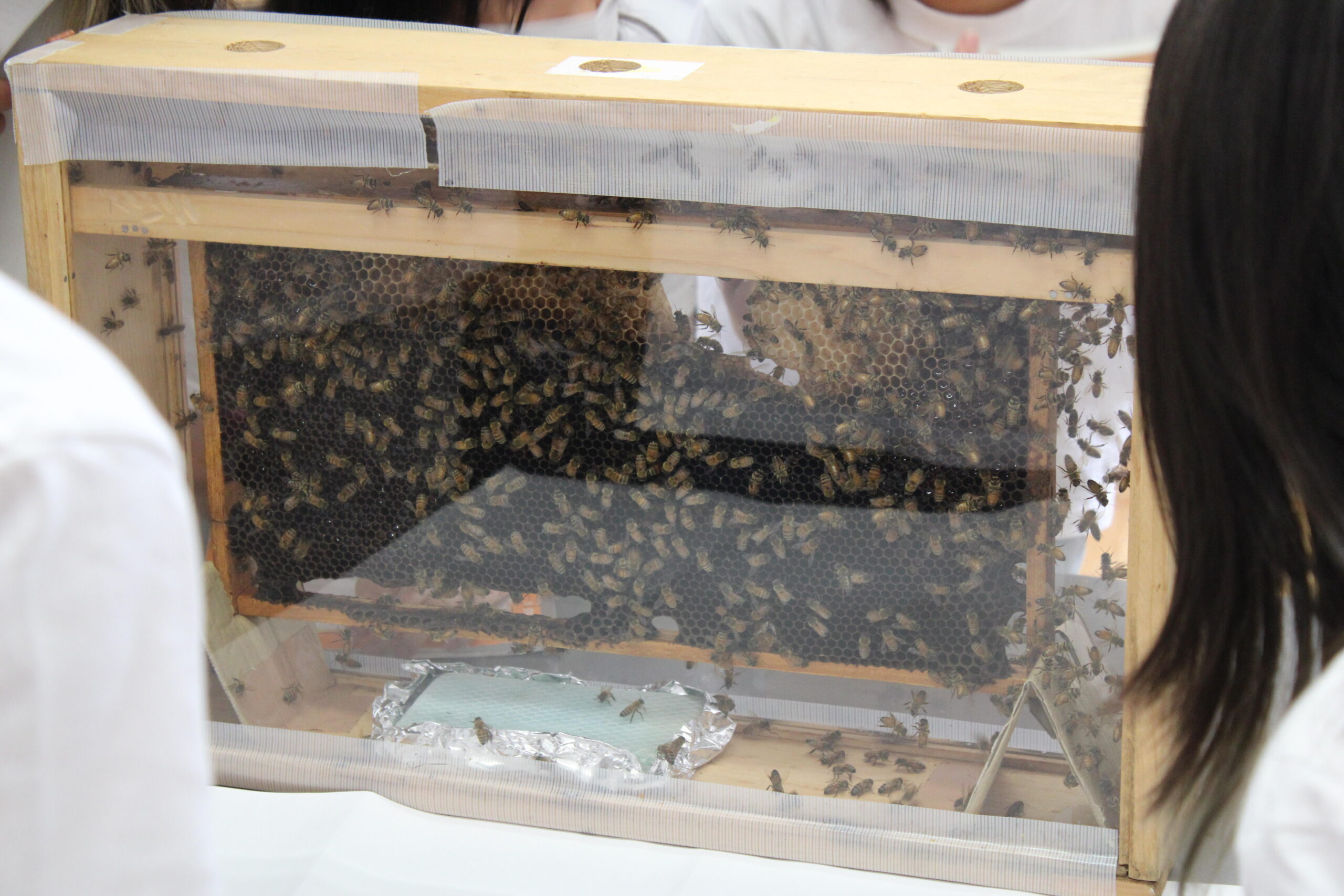 ミツバチ・プロジェクトの活動内容やミツバチについて多くの方に知っていただきたくBee Schoolに参加しました。自然を相手にする養蜂はなにごとも思い通りになることがなく、天気や季節、ミツバチの状態などに絶えずふりまわされています。最近では気温があがり、防護服を着ての作業は本当に大変です。Bee Schoolでは、観察箱の蜂をみて、「ミツバチかわいい」との声をいただきとても嬉しく、ミツバチに興味をもってもらえたかなと思います。これからも大学内外で交流を深めながら、地域にすこしでも貢献できるよう活動を続けていきたいです。