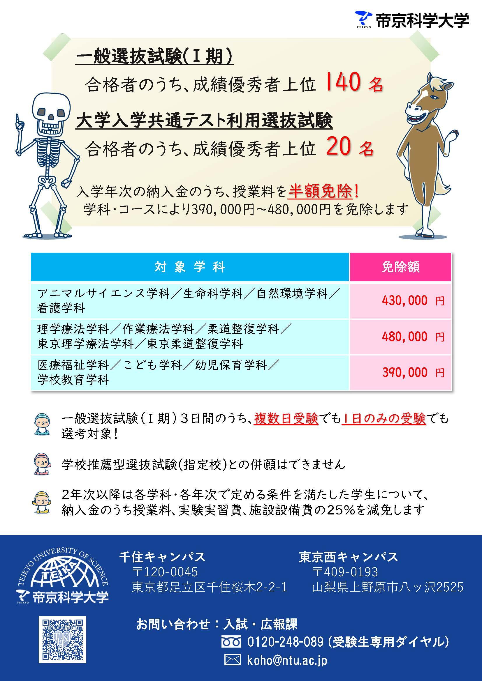 ・帝京科学大学が2024年度入試から総合型選抜試験(I期)で特待生制度を導入 — 合格者のうち成績優秀者上位50位以内の授業料を全額免除(2023.05.31)