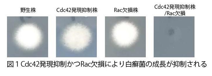 白癬菌の成長に必要な分子を探索するため、生物一般の細胞機能制御に必須のタンパク質である低分子量Gタンパク質に着目して研究を進め、事前の検討によりGタンパク質Cdc42及びRacが菌糸成長を促進することが示唆されました。そこで、遺伝子組換え技術を用いて、Cdc42の発現量の抑制に加えてRacを欠損させたところ、野生株(遺伝子組換えをしていない元の菌株)と比べて、顕著に培地*2上での成長が抑制されることが分かりました(図1)。