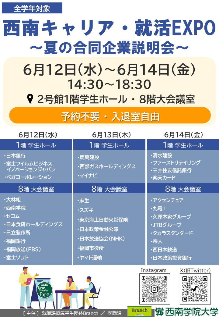 【西南学院大学】6月12日(水)~14日(金)西南キャリア・就活EXPOを開催〈学生企画型キャリア支援イベント〉
