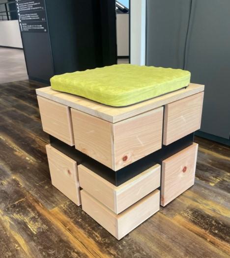 共同開発したプロトタイプ製品「スピーカー内蔵スクエア型ウッドチェアー(檜)」は、積み木をコンセプトにしたスピーカーユニット内蔵のイス型スピーカーボックスです。内蔵の振動音波スピーカーは、音圧で音を伝えるのではなく空気振動で音を伝達し、学内の休憩用椅子として空間BGMを流します。形状は6⾯のシンプルなボックス型で、サイズはおおよそ460×460×460(mm)です。積み⽊の要領で組み合わせて使えるため、空間デザインの発展性があります。デザイン・企画・スピーカー設計は東洋メディアリンクス株式会社が担当し、詳細設計と製造設計についてはマネジメント・コントロール研究室が担当しました。