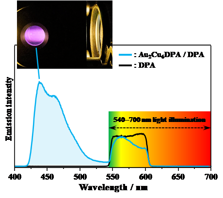 (添付:図2: Au2Cu6(S-Adm)6(PPh3)2増感剤あるいはAu2Cu6(S-Adm)6[P(DPA)3]2増感剤とDPA発光体を組み合わせた際の赤色光-青色光アップコンバージョン特性の比較)
