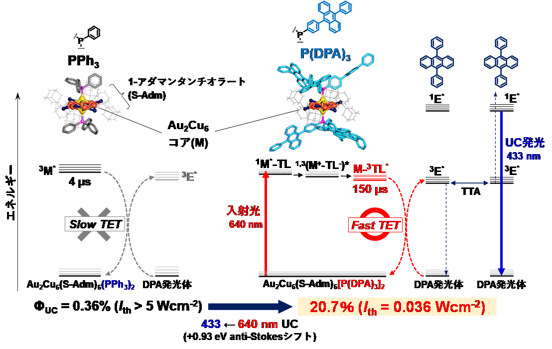 このようにTTA-UC機構は、発光体2分子間のTTAに基づく2光子過程であるため、最大のUC効率(ΦUC)は50%です。高効率化の鍵となるのは、増感剤における三重項生成量子収率(ΦT)、増感剤と発光体との間のTET量子収率(ΦTET)、発光体のTTA量子収率(ΦTTA)の向上です。本研究では、100%のΦTとΦTETを達成するため、図1に示すAu2Cu6(S-Adm)6[P(DPA)3]2(S-Adm = 1-adamanthanethiolate; DPA = 9,10-diphenylanthracene)を新たな増感剤として開発しました。
