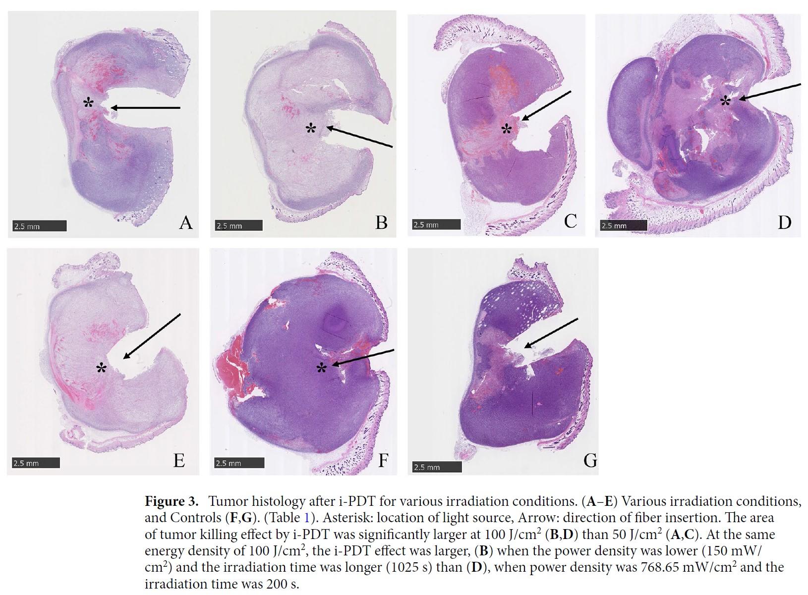 エネルギー密度は500J/cm²、100J/cm²、50J/cm²の3群で施行し、図2-Bの100J/cm²1025秒が最も効率よく腫瘍細胞への殺腫瘍効果を確認した。また同一エネルギー密度であれば長時間の照射がより効果的であった。この結果よりPDTは、短時間高エネルギー照射より長時間低エネルギー照射の方が、より効率的に殺腫瘍効果が得られることが明らかとなった(図2)