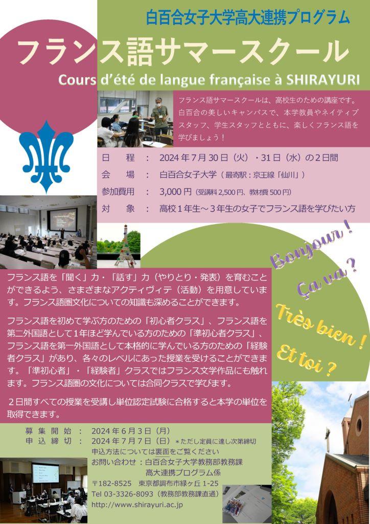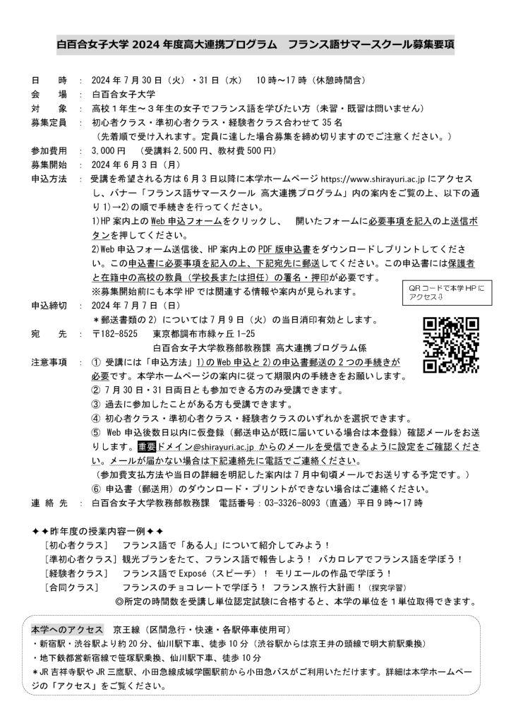・2024年度 白百合女子大学高大連携プログラム 高校生のためのフランス語サマースクール開催決定のお知らせ