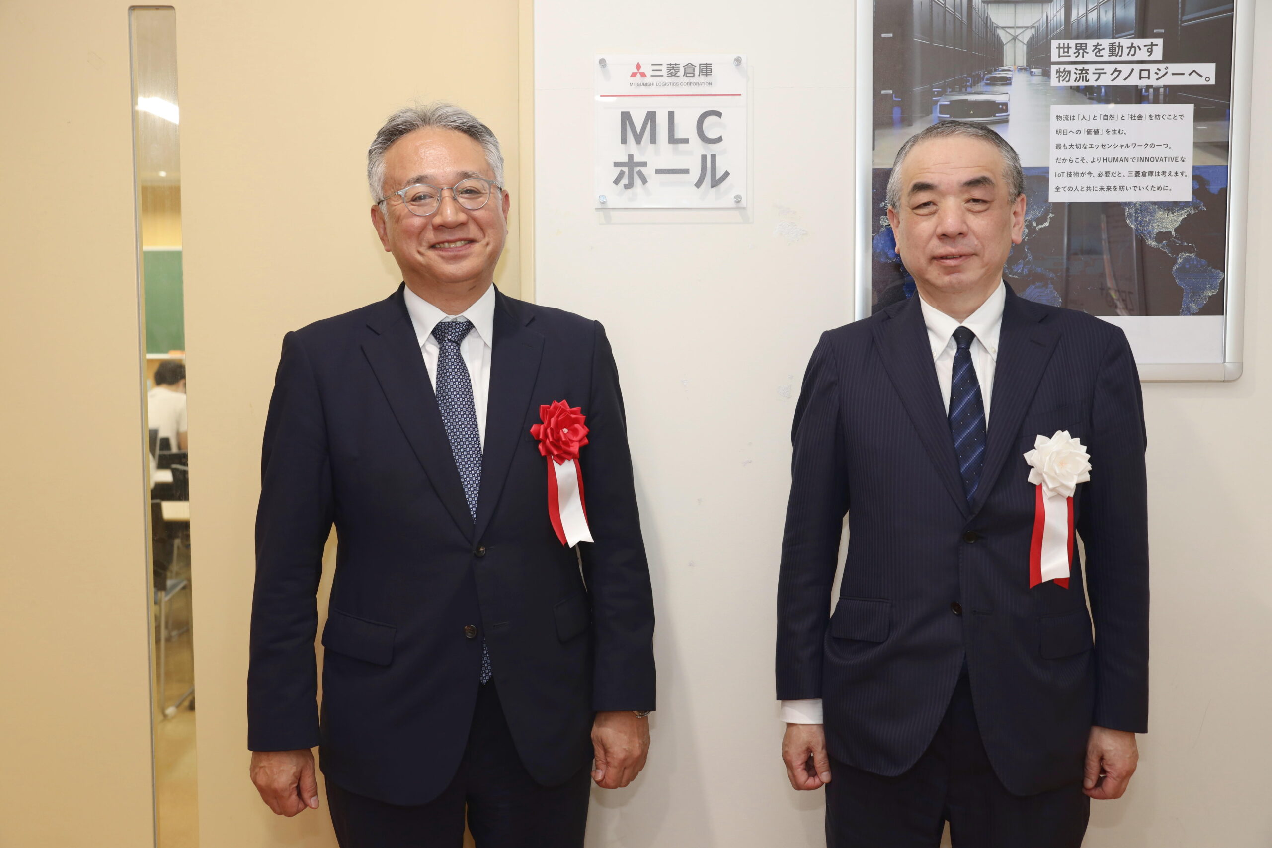 5月28日に開催された「MLC ホール」のオープニングセレモニーでは、両者の代表によるテープカットが行われ、講義室前に取り付けられた別称プレートと同社の企業紹介パネルを披露いたしました。