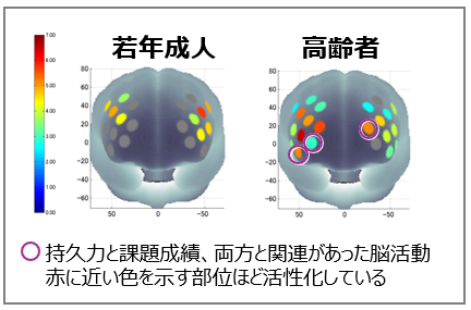 本研究で、高齢者は若年成人に比べて、前頭前野の広範囲を代償的に動員して高難度の課題を遂行しており、有酸素能力の高い高齢者では、より前頭前野の代償的な活性度が高く、これにより、有酸素能力の低い高齢者より優れた作業記憶能力を発揮している可能性を確認しました。