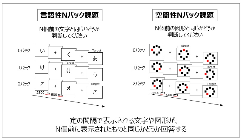 4.Nバック課題:作業記憶能力を測定するために広く使用される認知心理学のテスト。当研究で用いた言語性2バック課題ではパソコン画面にランダムにひらがなを表示し、2つ前に表示された文字と同じかどうか回答するよう求めた。