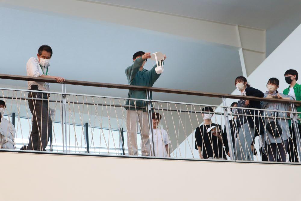 新入生は3~4人ずつのチームに分かれ、A2ケント紙1枚・はさみ・ものさし・セロハンテープなどを使って卵を守る緩衝器を製作。その後、OECUイノベーションスクエア(A号館)3階から卵を落とし、卵を割らずに落下させたチームは優秀賞となり、的の中心から落下地点までの距離が近い順に順位がつけられる。