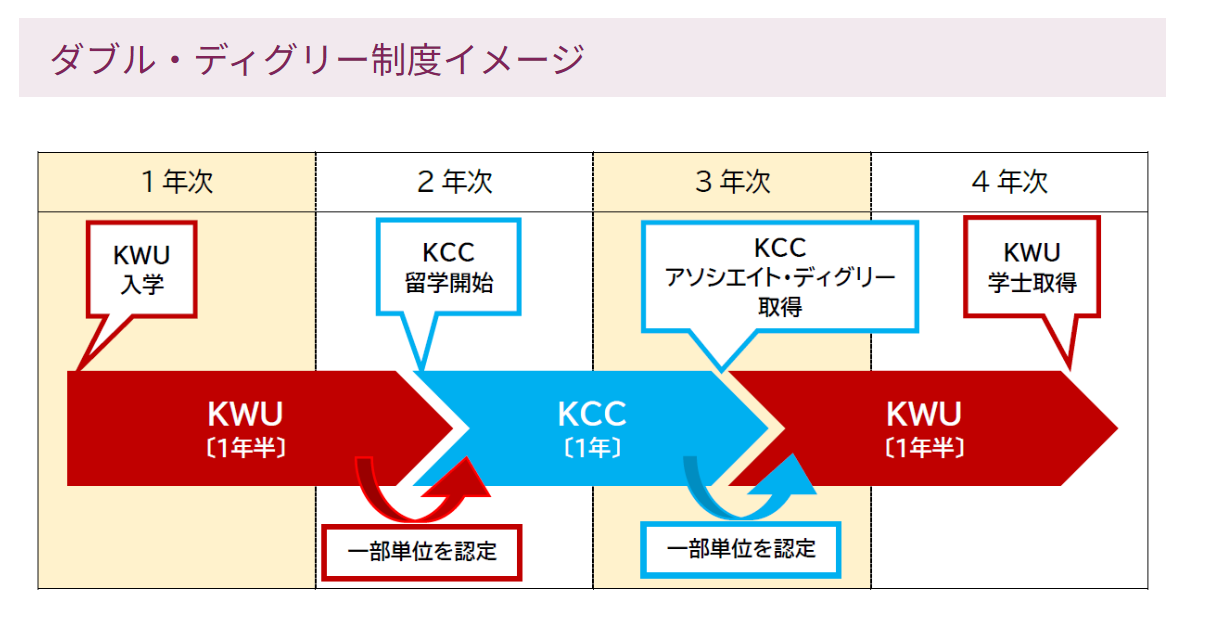 ②本来なら6年間(KWU 4年間+KCC 2年間)掛けて学位を2つ取得するところ、相互に単位認定を行うことにより、4 年間※で両大学の学位取得が可能となる。