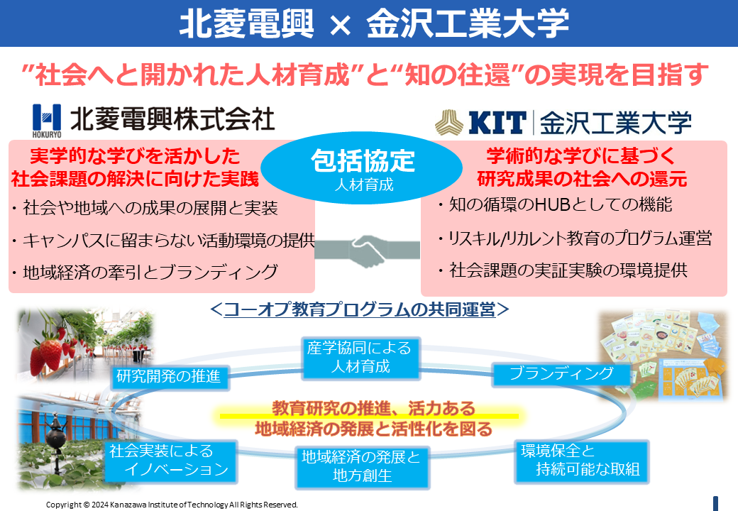 このたびの北菱電興と金沢工業大学との包括連携協定が目指すのは、産学連携による「”社会へと開かれた人材育成”と”知の往還”の実現」です。