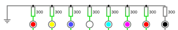 参考課題として、CMOSリング発振回路(図1)を用いたチャレンジが含まれる。この課題では、特定の条件下で抵抗値を変更し、限られた時間内に7つのLEDが順番(図2)に点灯するよう設定を調整する技術が試される。