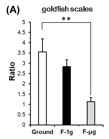 Ground:地上実験,F-1g:宇宙空間で遠心機を回して1gの条件(地上と同じ1g)を作り出すことができる装置に入れて培養したウロコ(宇宙対照群),F-μg:宇宙空間で培養したウロコ(微小重力群),**: P < 0.01,n = 4(Ikegame et al., J. Pineal Res., 2019より)
