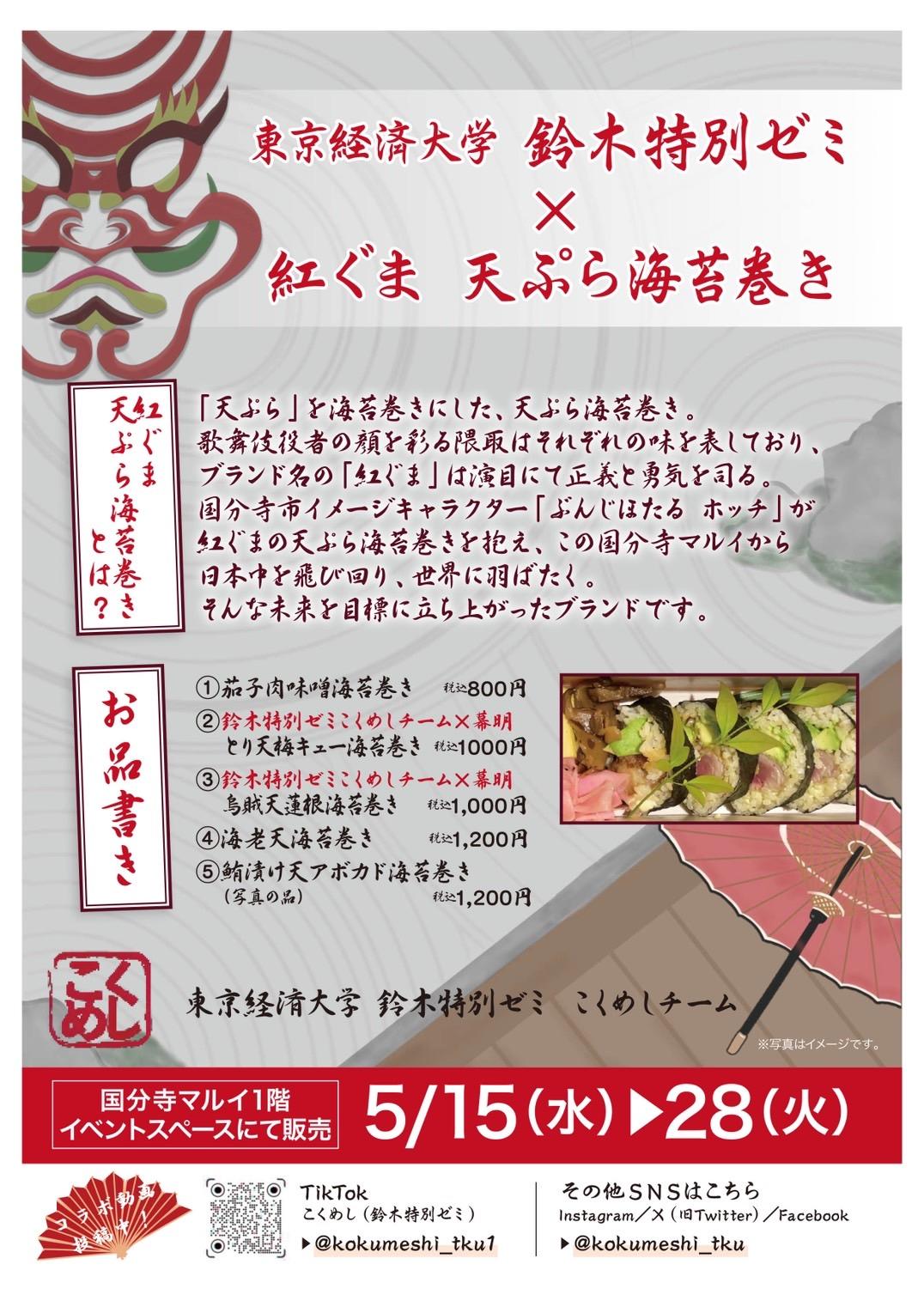東京経済大学(東京都国分寺市 学長:岡本英男)鈴木恒雄特別ゼミの、国分寺の魅力のひとつとして国分寺の食を軸にプロジェクトを進める『こくめし』チームが、弁当事業のプロデュース等を手掛ける株式会社幕明、国分寺マルイと共同開発した「天ぷら海苔巻き 紅ぐま」を期間限定で販売します。