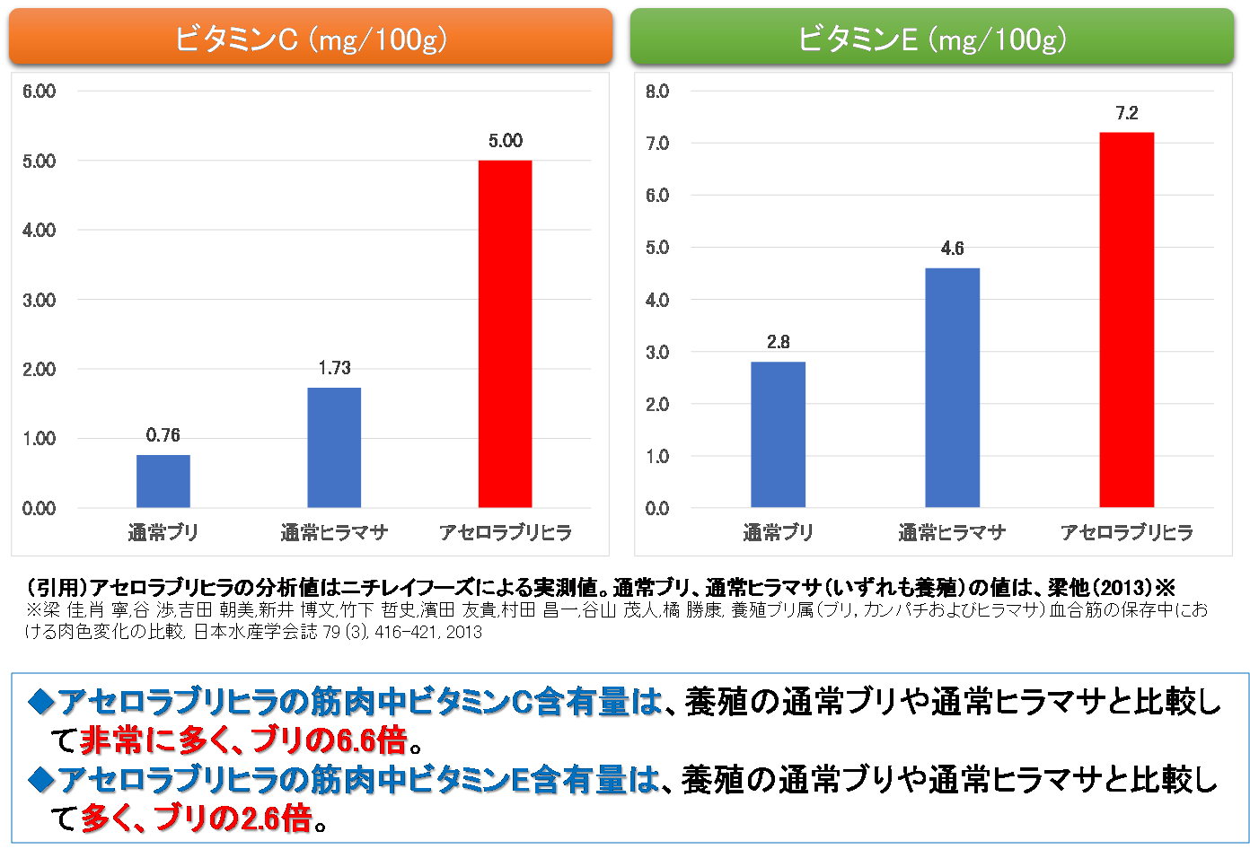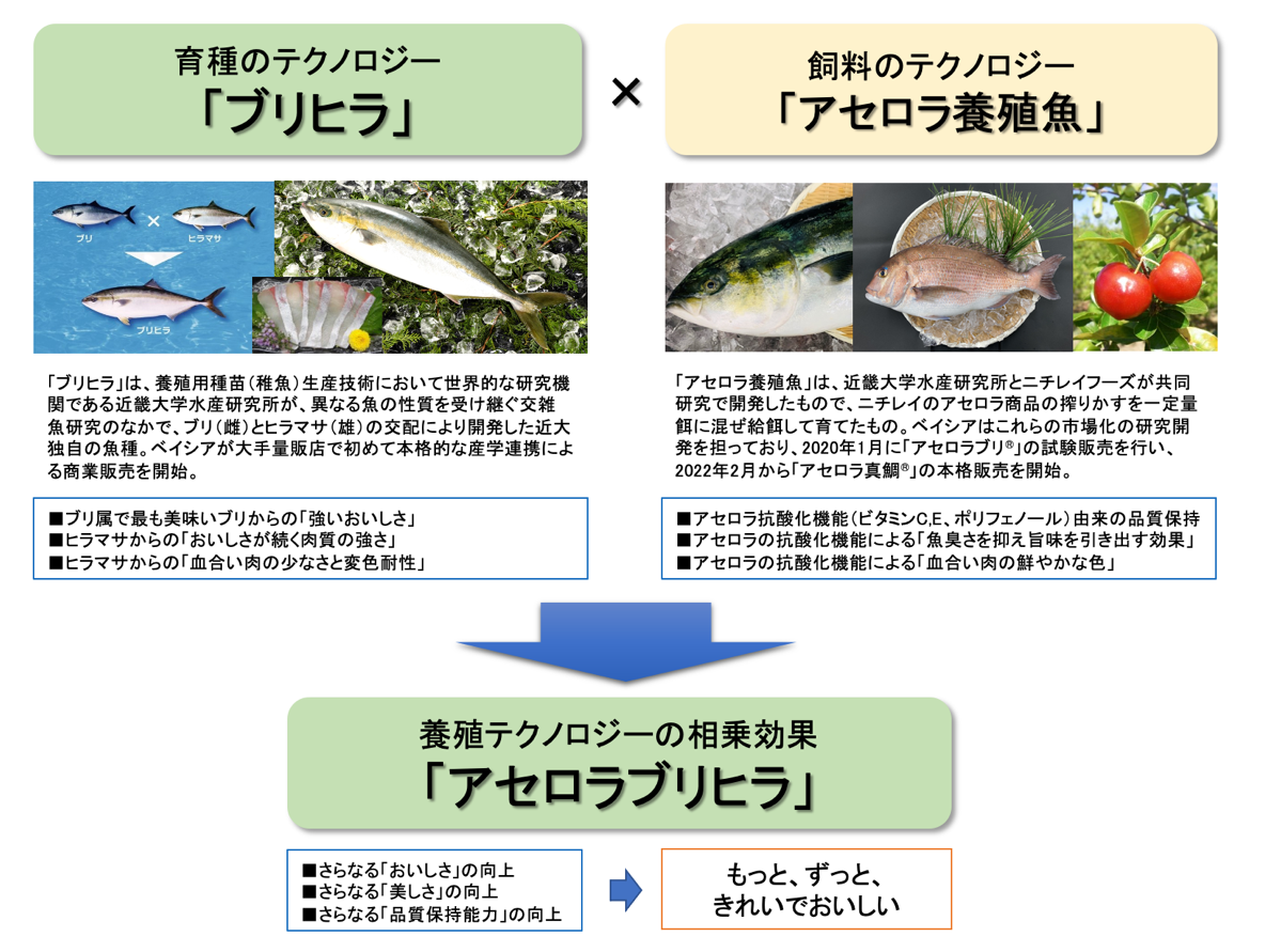 ブリヒラに、においを抑え品質の維持が可能なアセロラ魚のテクノロジーで品質改善を実現したのが「アセロラブリヒラ」です。ベイシアではすでに近畿大学とニチレイフーズが共同開発した「アセロラ真鯛®」、「アセロラぶり®」を全店舗で本格販売しており、今後も連携してアセロラ魚をお客様に提供します。