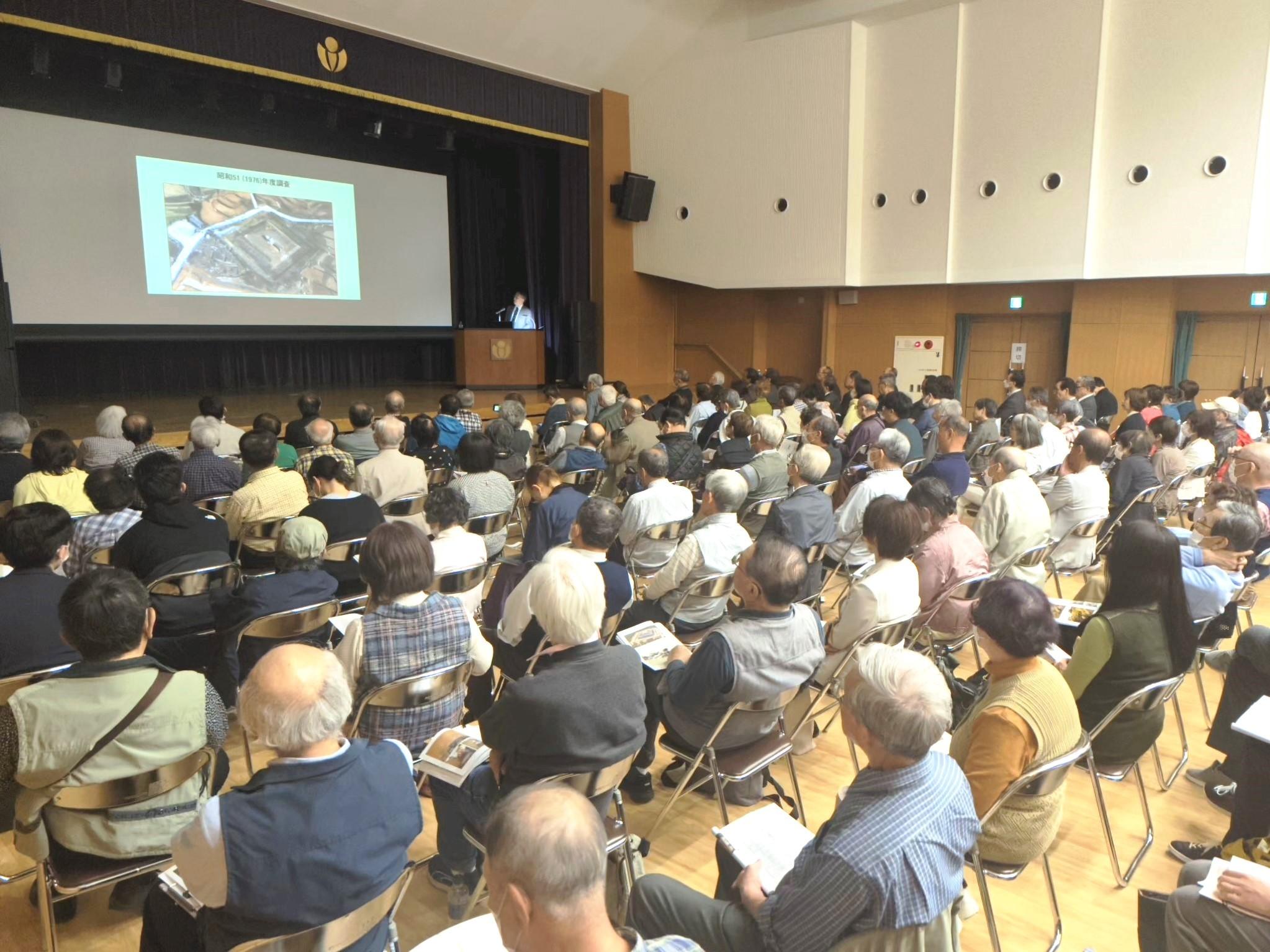 開講式では関西大学の芝井敬司理事長、前田裕学長が挨拶。明日香村の森川裕一村長が「明日香村の古墳、遺跡についてわかりやすく伝えていくため、関西大学と協力していきたい」と飛鳥の遺跡群の世界文化遺産登録を目指す思いを語りました。また、50年目を記念して制作された短編映画「飛鳥とともに~BEYOND 50YEARS」が上映されました。貴重な記録写真・映像を使い、再現映像などもつくりこんで、この講座を立ち上げ、継続してきた関係者の努力を伝える内容に、満席となった会場から大きな拍手が送られました。そのあと「蘇我氏四代の野望と挫折 ―墳墓に反映された飛鳥時代前期の権力抗争―」と題して、本学飛鳥文化研究所・植田記念館名誉館長で本学名誉教授の米田文孝氏が講演。蘇我氏の歴史的な位置づけと明日香村の古墳の調査結果についての丁寧な解説に、訪れた人は熱心に聞き入っていました。