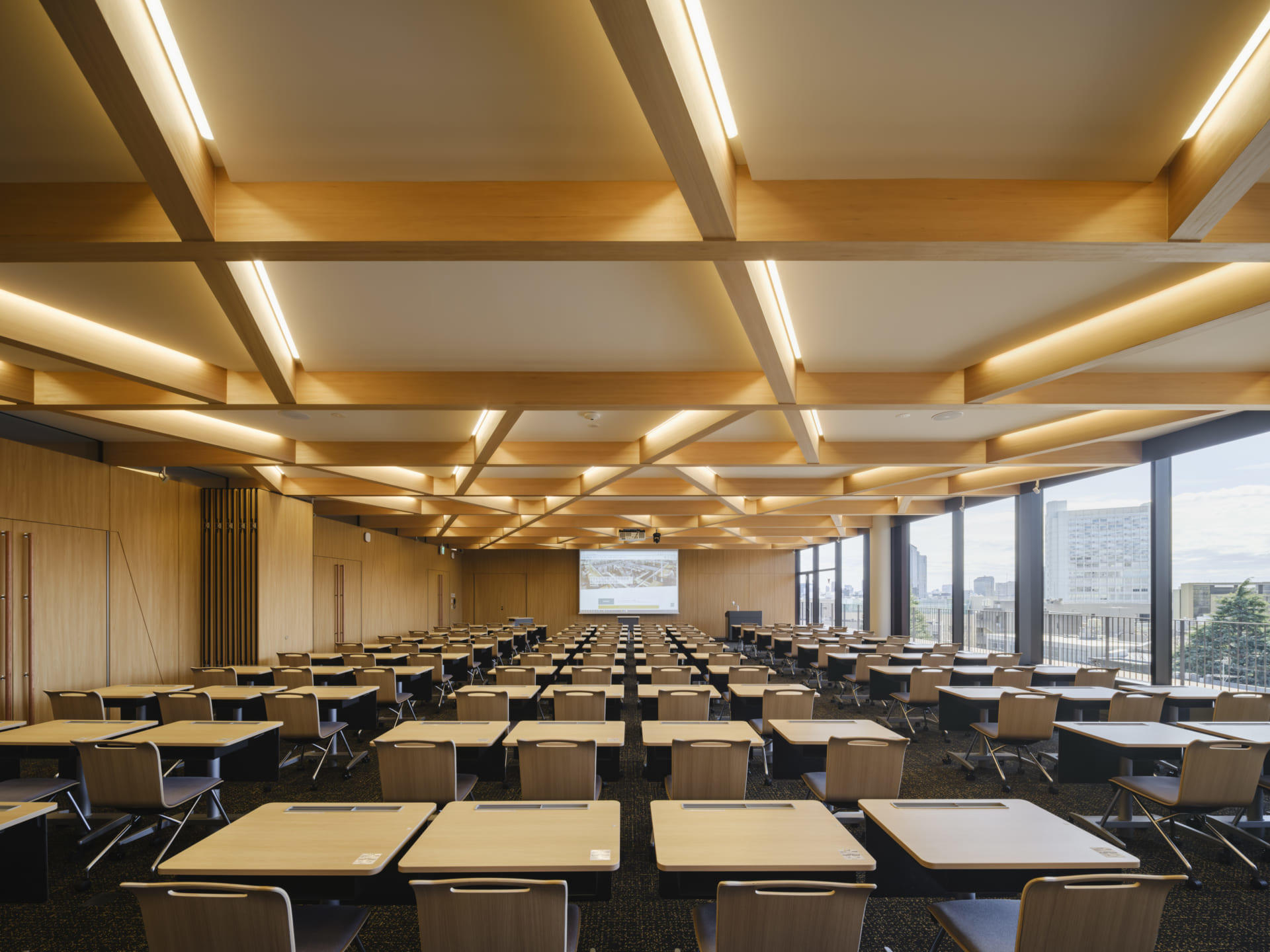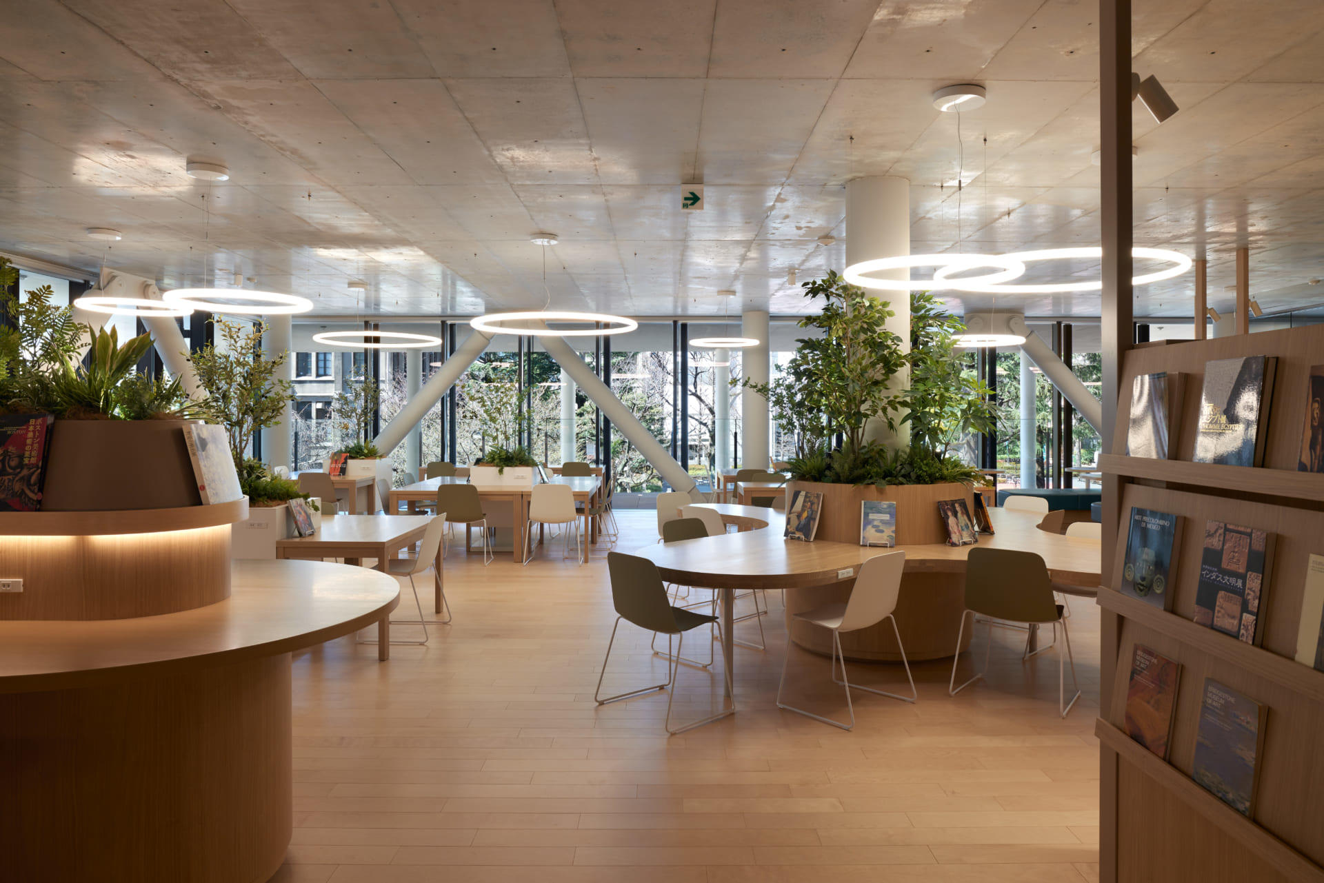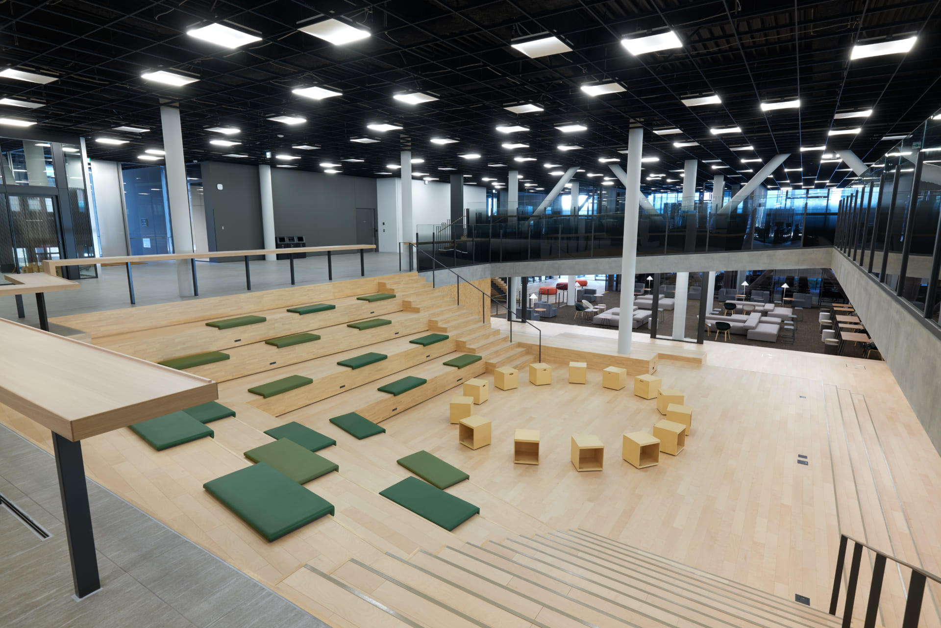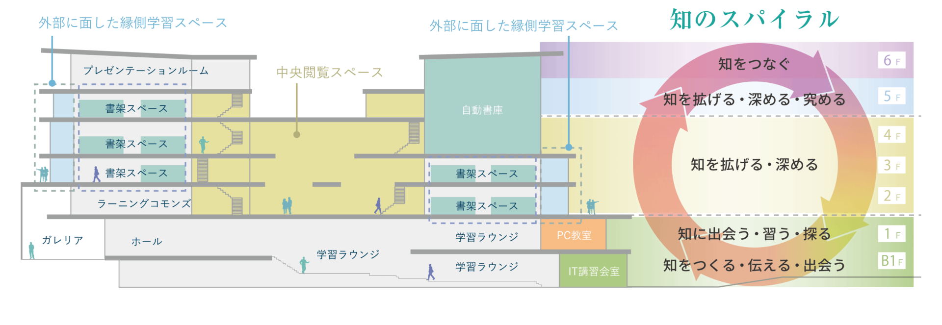 情報学習フロアは「知との出会い」を実現する空間として、全学生に関連のあるPC教室、語学や最先端のICT(情報通信技術)を学べる設備環境を整えた。また図書館フロアの2~4階は「知を拡げる」場所として、個人で文献を読むだけでなく、学生同士で学び合えるラーニングコモンズなどを設けている。5・6階は「知を深める」ための専門的な文献や研究個室のほか、学外とのオンライン会議にも対応できるプレゼンテーションルームを配置し、より専門性の高い学習や討論のできる環境を提供している。
