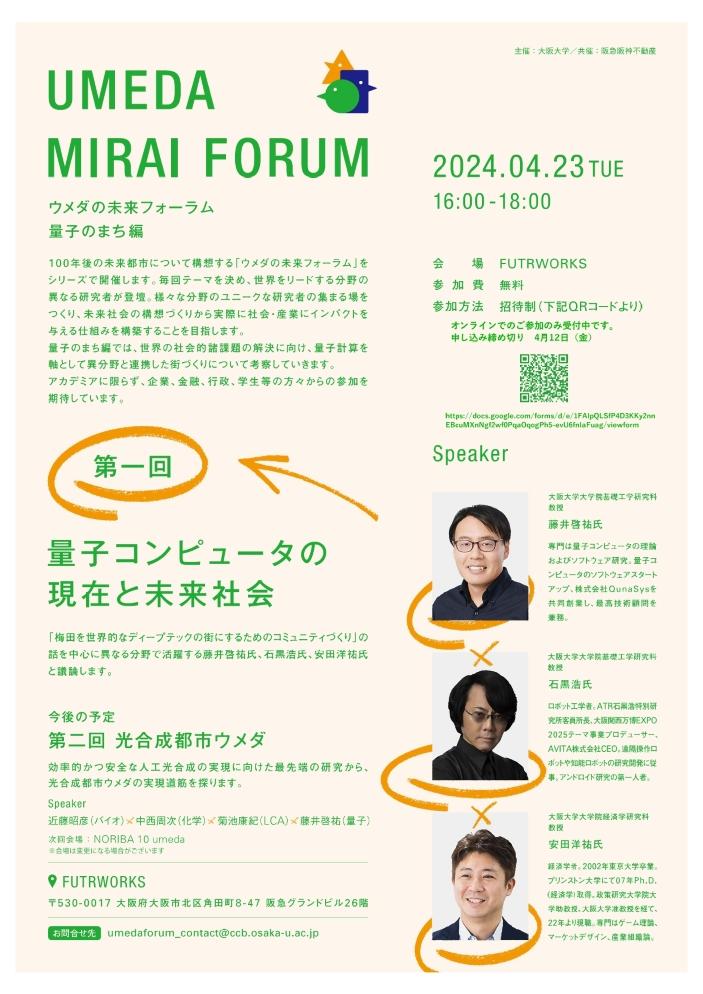 大阪大学では、最先端かつユニークな研究者が分野を超えて集まり、よりよい未来社会の実現を参加者とともに議論する、「ウメダの未来フォーラム」第1回を、4月23日(火)に開催します。ウメダの未来フォーラムは、世界をリードする研究者が100年後の未来都市について構想を議論するシリーズです。議論を通じて社会、産業にインパクトを与える仕組みの構築を目指します。第1シリーズの量子のまち編では、世界の社会的諸課題の解決に向け、量子計算を軸に異分野同士が連携した街づくりについて考察します。シリーズ第1回は「量子コンピュータの現在と未来社会」と題し、大阪大学の量子コンピューティングの第一人者・藤井啓祐教授、ロボット工学の石黒浩教授、経済学者の安田洋祐教授が、梅田を世界的なディープテックの街にするためのコミュニティづくりを中心に、参加者とディカッションを行います。