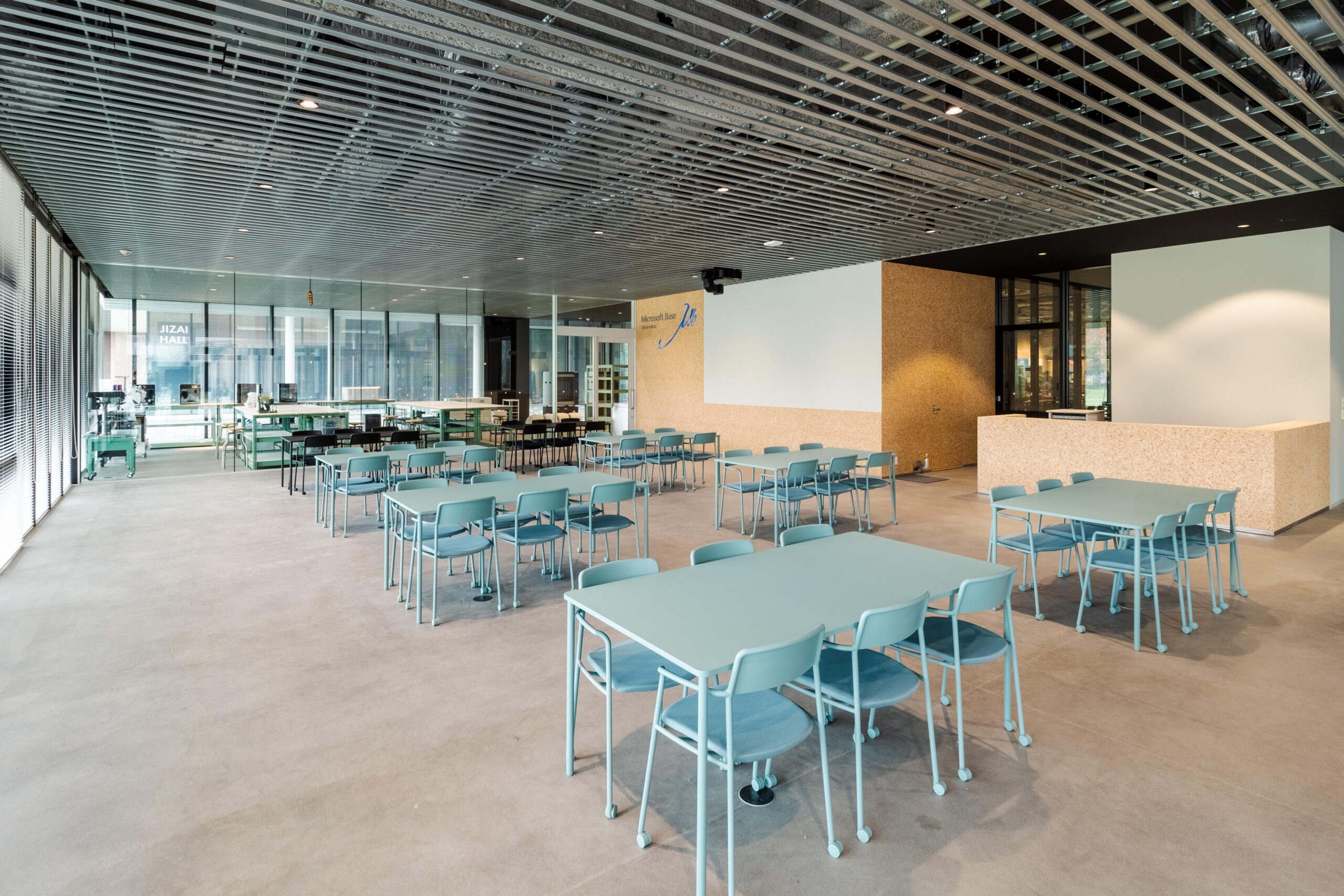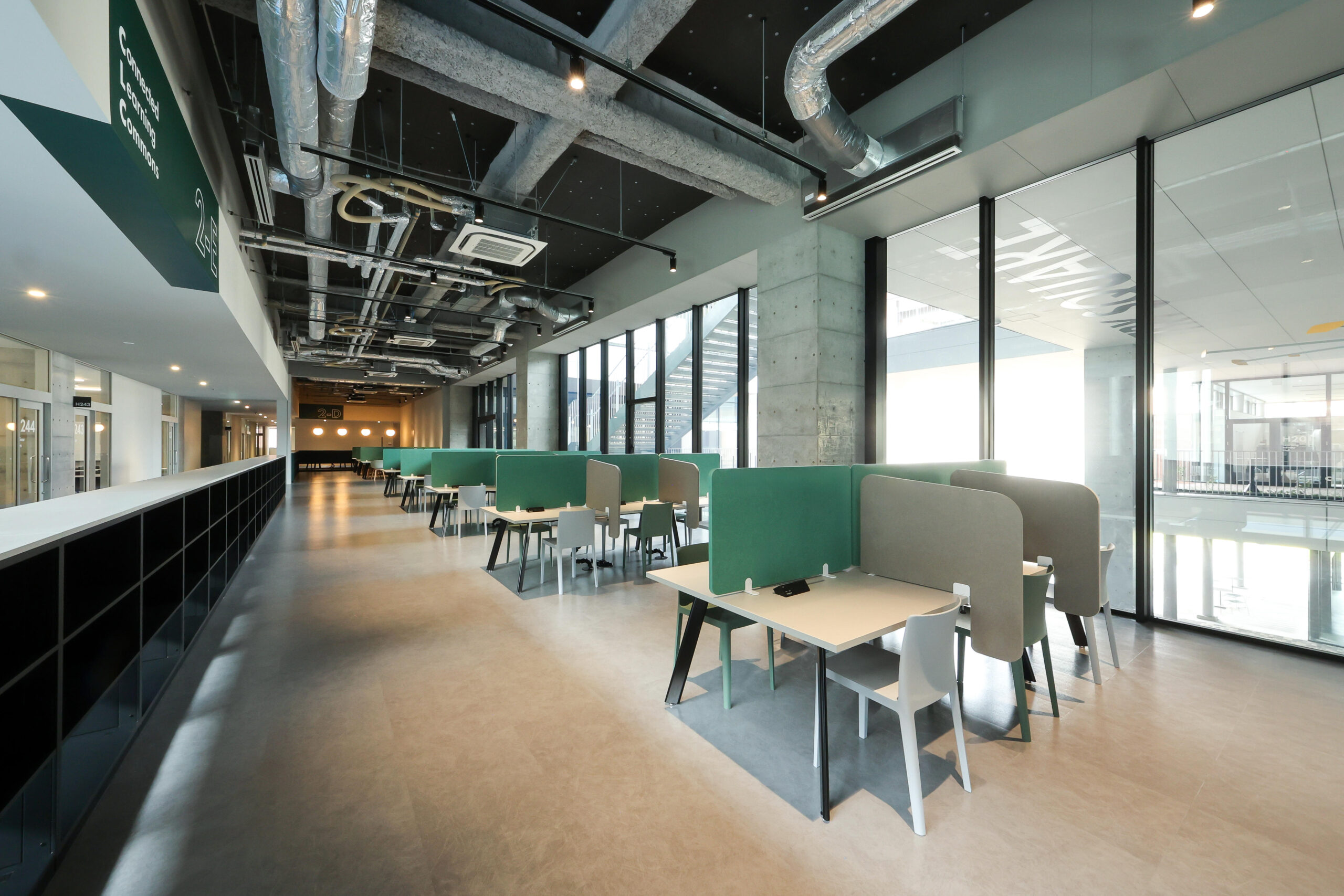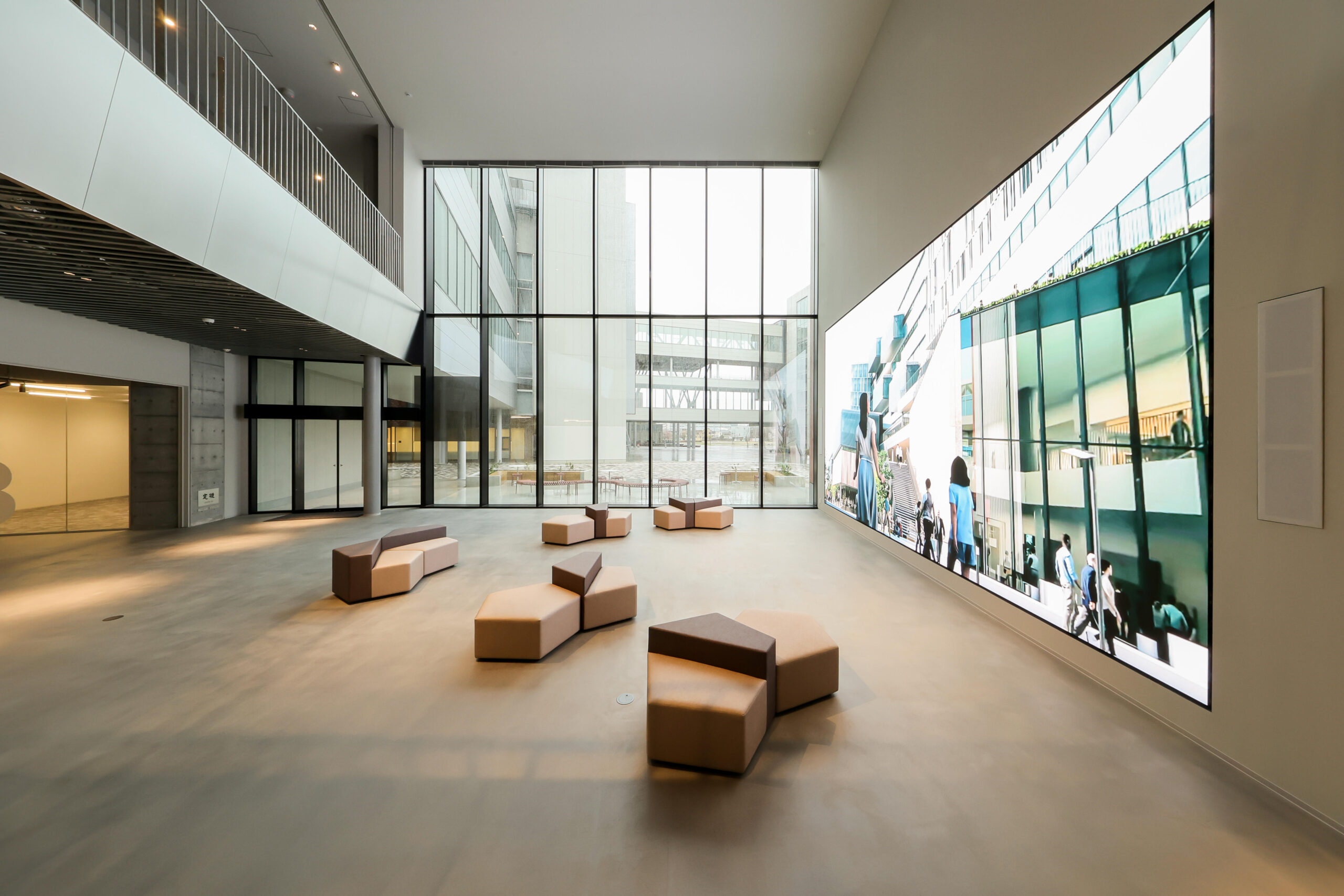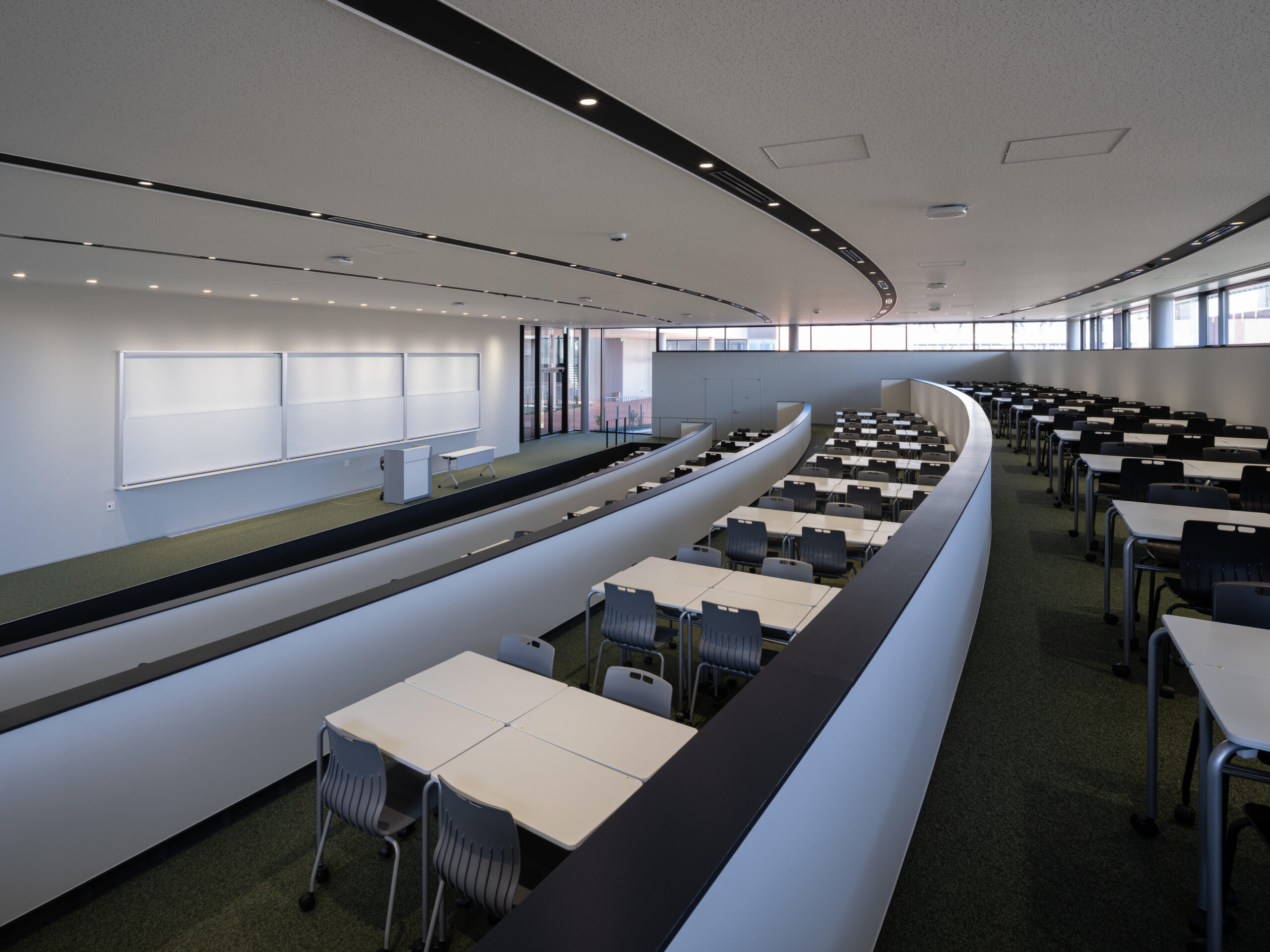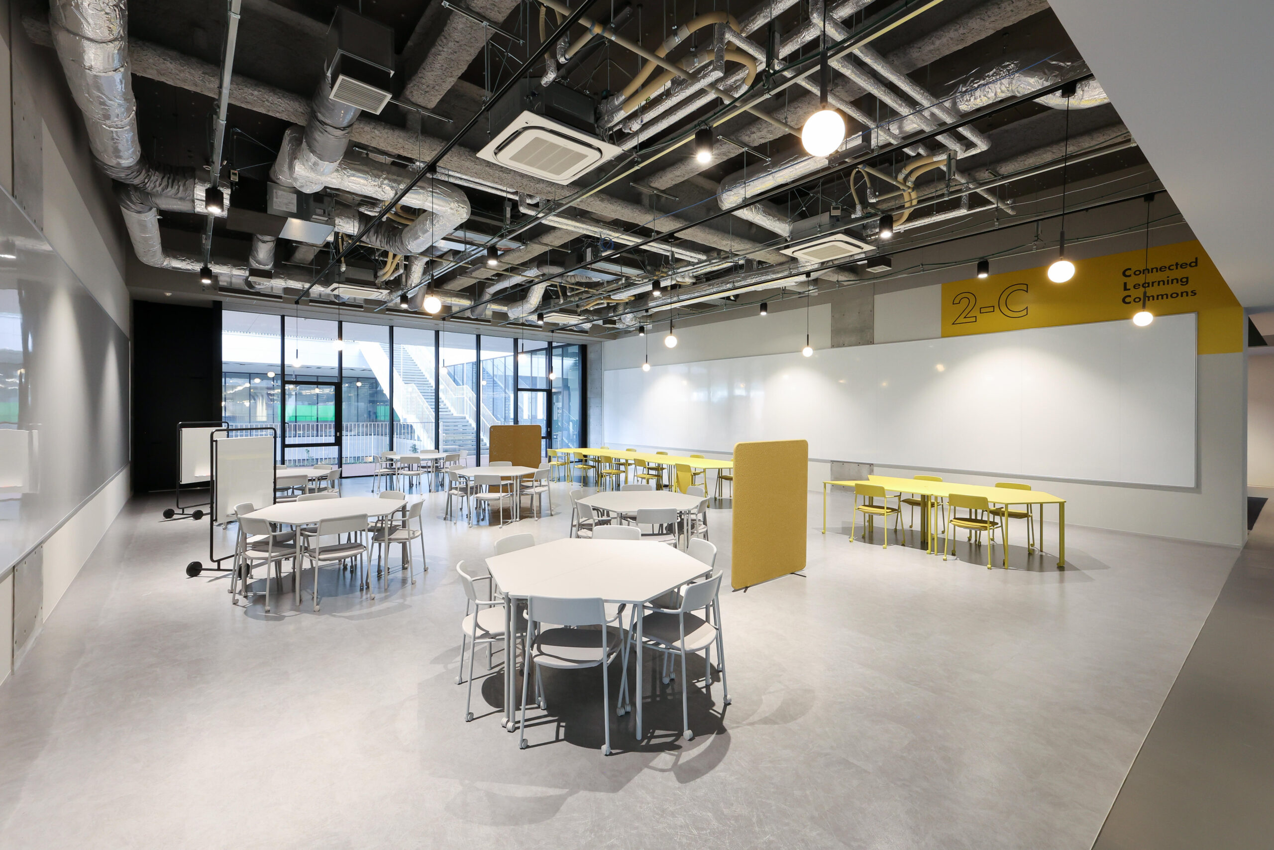 また、OICの既存棟で培ってきた「いつでも・どこでも・誰とでも」議論し、学び合えるラーニングコモンズの機能もアップデート。これからの学びの場には、学生が主体性をもって個人と集団、リアルとバーチャルを行き来しながら多様に学ぶことができる、ハイブリッドな学習環境が必要と考えました。教室の回りに併設された「多様なスタイルの学びを選択できるコモンズ空間」(Connected Learning Commons)や対面授業とオンライン授業が融合した「ひな壇状のアクティブラーニング教室」(Learning Infinity Hall)など、これまでにない新たな学びの場の創出に挑戦しています。また、学ぶ意欲を刺激するウェルビーイングの観点より、半屋外空間を融合させながら、教室やコモンズを配置しています。
