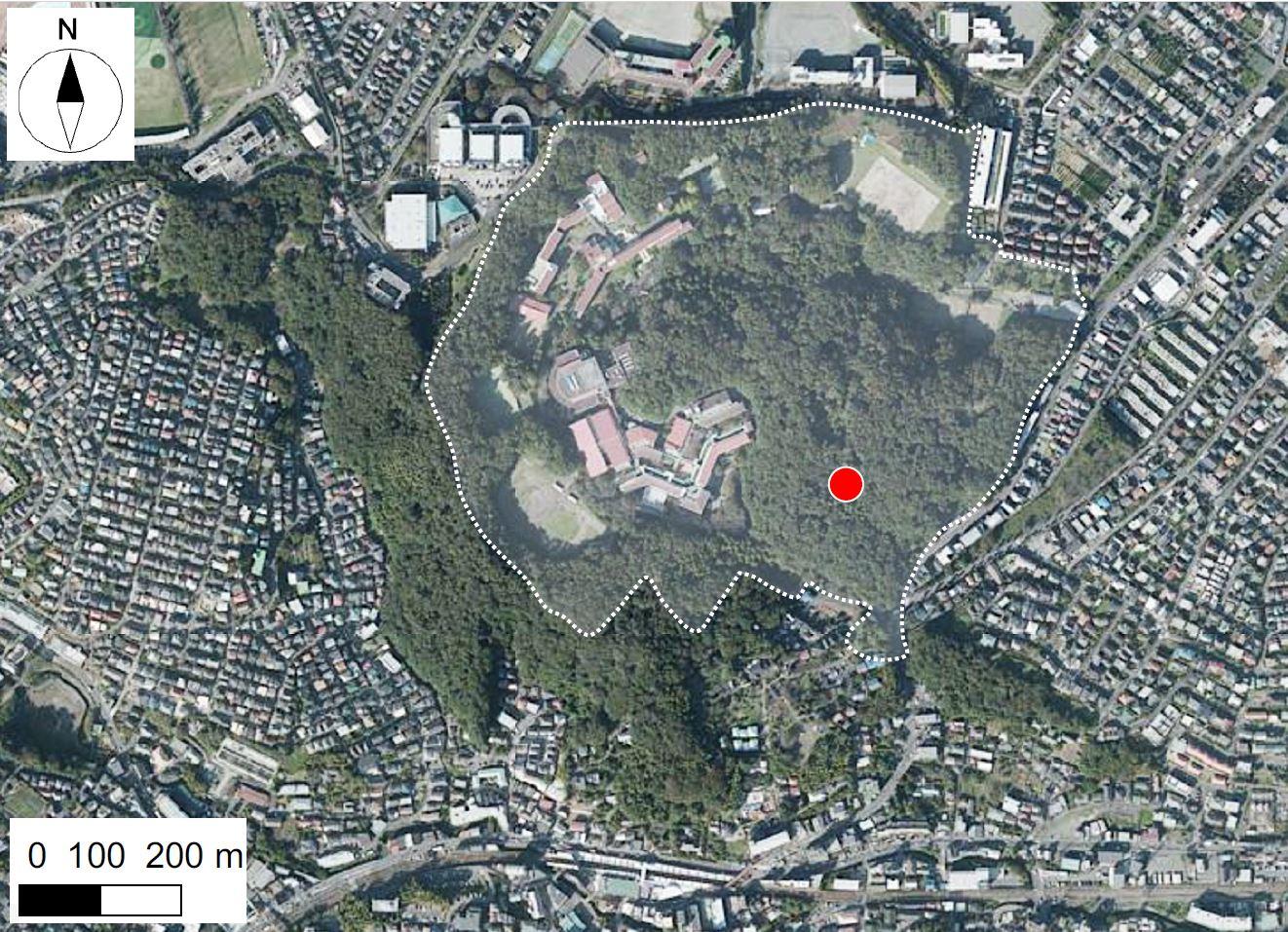 調査地は、神奈川県川崎市にあるに日本女子大学 西生田キャンパスです(図4)。西生田キャンパスは、東京都心から南西に約19 kmの距離に位置し、校地面積(293,800 m2)のうち約6割が森林に覆われた都市域に存在する小規模森林です。西生田キャンパスは、AMPsの主要な発生源と考えられる都市近傍に存在することから調査地として選択しました。西生田キャンパスの主要樹種であるコナラの葉を、2022年6月21日および8月9日に採取しました。なお、コナラは日本における主要な広葉樹でもあります。