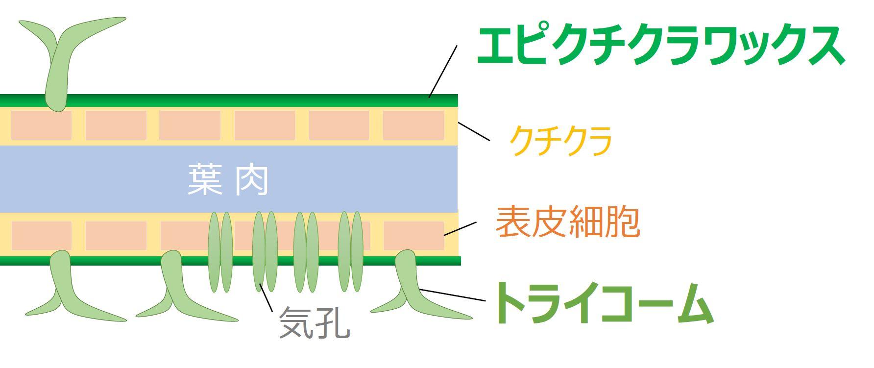 葉面に存在する飽和/不飽和脂肪酸で構成されるコーティング構造です。植物の内皮を構成する表皮細胞は、クチクラで覆われその一部が植物体外表面を覆うコーティングを形成し、これをエピクチクラワックスとなります。紫外線や外敵から植物組織を守る防護壁として機能しています。