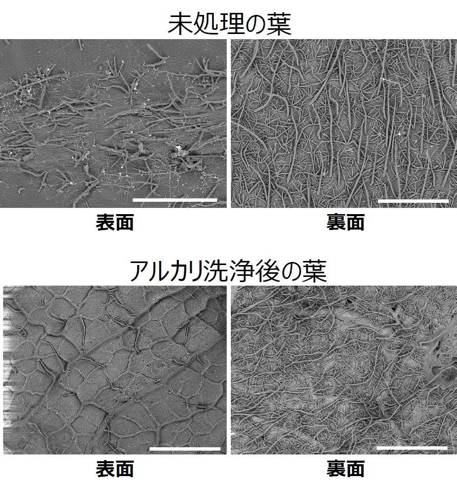 葉面のエピクチクラワックスに捕捉されたAMPsを回収する手法として、上述したアルカリ洗浄を開発しました。アルカリ試薬を用いた処理は、これまで魚や貝などの生体試料に含まれるマイクロプラスチックの分析に広く使用されており、プラスチックへ影響を与えない範囲で生体組織を効率的に分解できることが報告されています。これを葉面エピクチクラワックスの分解に適用できる方法を新たに開発しました。この洗浄前後の葉面の観察により、葉面エピクチクラワックスがアルカリ洗浄によって完全に分解され、通常であればその下に存在する表皮細胞と見られる部屋のような構造体が完全に露出している様子を確認しました(図5)。