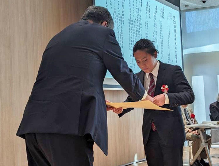この度、名誉ある賞を頂戴し、誠に光栄に思います。このコンテストは、指導教員である川瀬由高先生にお声がけいただいたことを契機に、私の目標となっておりました。受賞の通知をいただいた際、指導していただいた川瀬先生をはじめ、共に議論を深めたゼミ生や、調査にご協力いただいた皆様があってこその受賞だと深く感じました。本研究を支えてくださった方々に心から感謝申し上げます。