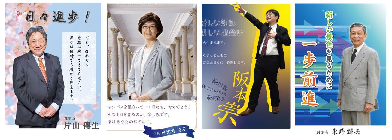 教員(理事長から学科長まで計25名)から卒業生・修了生に贈るメッセージを集め、写真とともにポスターを制作して、正門前に掲示しました。恩師の言葉を胸に、学生たちにはこれからの未来に向かって突き進んでほしいと考えています。教員自らの言葉で表現した唯一無二のポスターです。