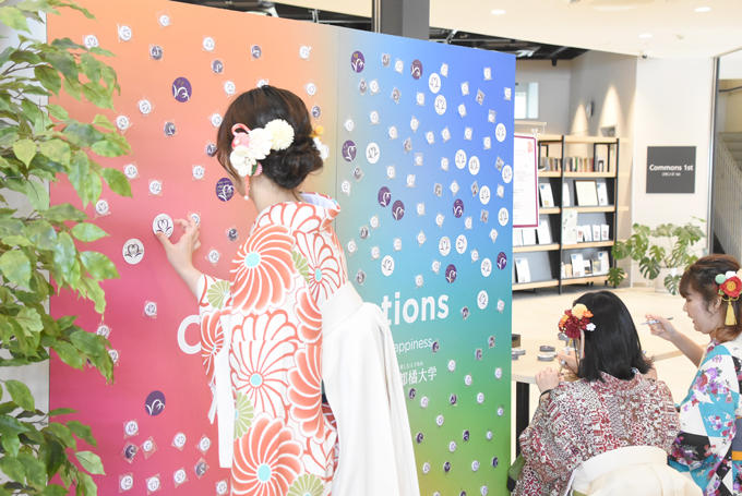 社会の中でさまざまに活躍している先輩卒業生からの応援メッセージをフォトスポットとしてデザインし、キャンパス内を彩ります。また、大学生活を支えていただいた地域の方からのお祝いメッセージをもとに、オリジナル山科マップをつくりました。