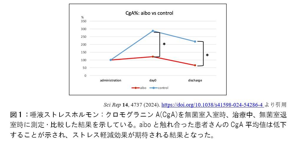 隔離環境下での長期入院を要する造血器腫瘍患者に対し、患者のストレスホルモンを定期的に測定した結果、ペット型ロボットの介入による一定の心理的ストレス改善効果が認められた。また、ペット型ロボット介入による安全上の影響はなく、運用可能であると考えられる。(図1)