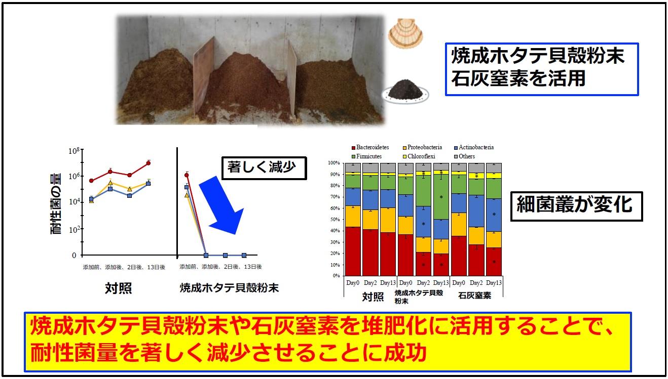 -家畜糞便を堆肥化する際 、焼成ホタテ貝殻粉末を堆肥に添加する事で、薬剤耐性菌を著しく減少させることに成功