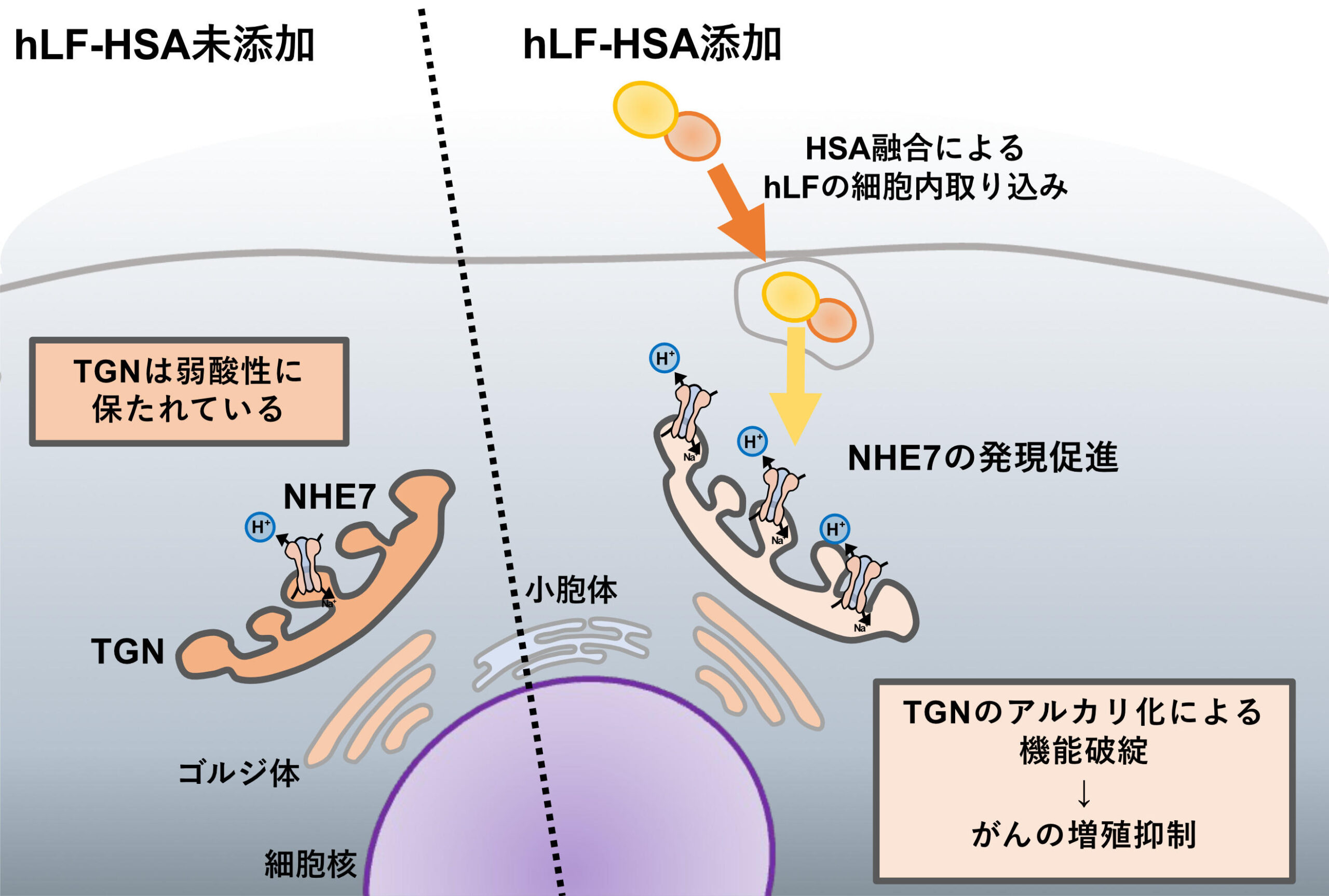 hLF-HSAは、肺腺がんの細胞内小器官を弱酸性からアルカリ化し、その増殖を阻害しました(図1)。一方、hLF-HSAによる細胞内小器官のアルカリ化及び細胞増殖阻害は、遺伝子ノックダウンによるNHE7機能阻害により著しく減弱したことから(図1A,B)、NHE7がその標的分子であることが示されました。hLF-HSA処理により、NHE7の発現量が上昇したことから、hLF-HSAは、TGNで機能するNHE7の発現量を高めることでTGNをアルカリ化し、がんの増殖を抑制することが明らかとなりました(図2)。