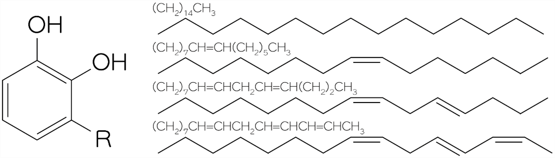 ウルシ科の多くの植物に含まれる物質。漆の原料であり、触れると皮膚に発疹を生じ「漆かぶれ」の原因としても知られています。