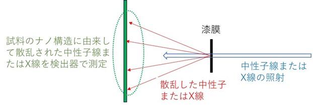 本研究では、図2に示すような生漆膜と0.3 %の鉄を含む黒漆膜に対して、非破壊で透過性の高い放射光、X線、中性子線をあて、それぞれの量子ビームの特徴を活用して多角的に構造を観察しました。