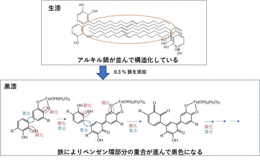 漆は、耐水性・耐薬品性に優れた稀有な天然塗料です。様々な日用品や装飾品の塗装に用いられてきました。近年では、漆を利用した新たな材料開発も注目されています。生漆に刀などから削り出したごく微量の鉄を加えると、非常に美しい漆黒が作り出されることが古くから知られています。しかし漆の構造や反応はほとんど解明されておらず、何故黒色になるかは現代でも明らかにされていません。