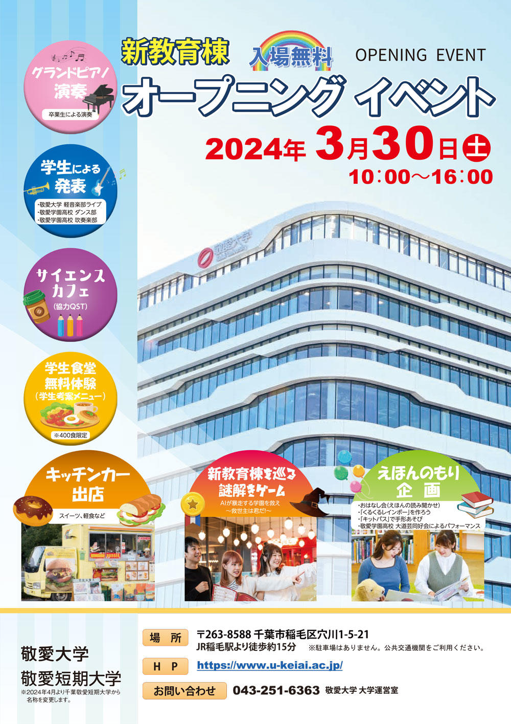 敬愛大学・敬愛短期大学が3月30日に稲毛キャンパスで新教育棟オープニングイベントを開催 ― 学生の活気に溢れるキャンパスを実現し、地域に開かれた学園として発展することを目指して
