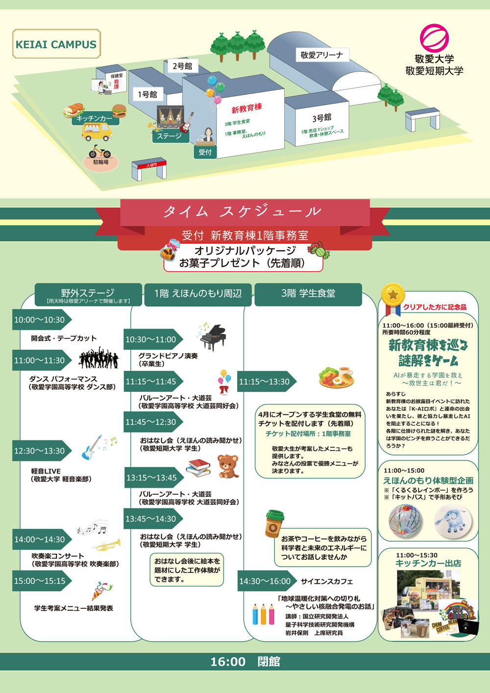 その他、えほんのもり(※)の読み聞かせや体験型企画、学生による発表、食堂無料体験(400食限定)、サイエンスカフェなどイベントが豊富に用意され、1日中楽しむことができる。