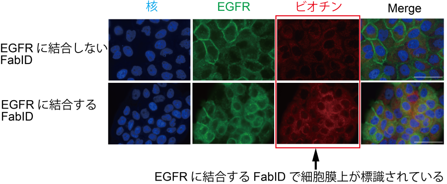exPPIを解析する膜タンパク質は、がん遺伝子として知られている細胞膜上のタンパク質である上皮成長因子受容体EGFRを標的としました。EGFRを発現する細胞である上皮様細胞癌由来細胞(A431細胞)(以下、上皮がん細胞と明記)にFabIDとビオチンを添加したところ、FabIDを使用して細胞膜上のEGFRをビオチン標識できることが培養細胞レベルで確認されました(図2)。