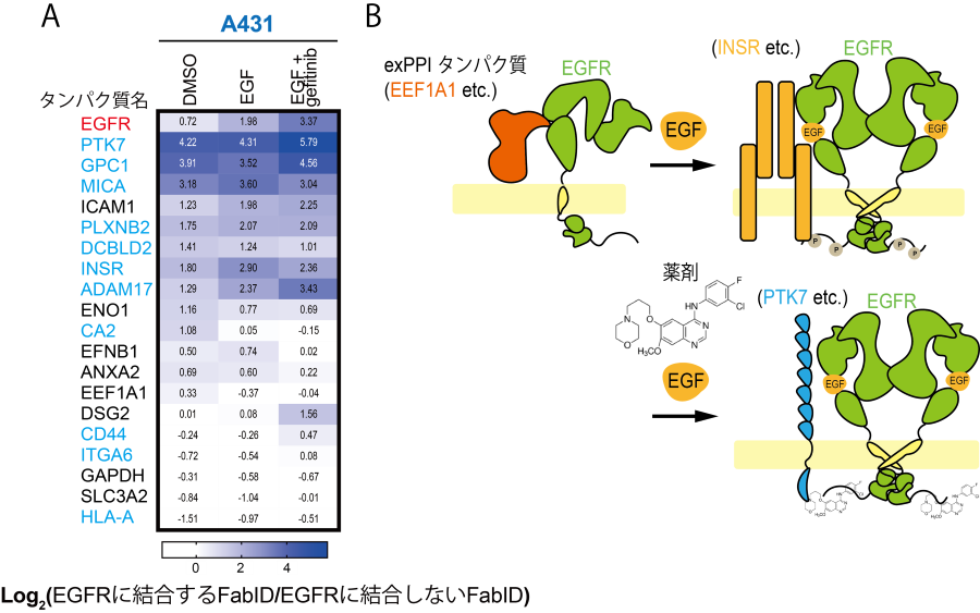 B)EGFRのexPPI変化を表した図。上皮がん細胞の場合は、EGF が結合していないときはEGFRとEEF1A1は近接している。EGFが結合するとINSRとEGFRとの近接している度合いが上がり、そこに薬剤が結合するとPTK7とEGFRの近接している度合いが上がる。