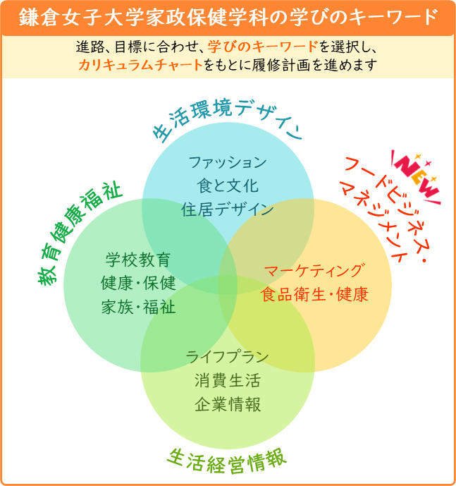 鎌倉女子大学家政学部では食分野における教育研究の専門性、地域や企業との連携プロジェクトによる商品開発等の実績を活かし、フードビジネス・マネジメントを学べるカリキュラムを充実します。家政保健学科の学びのキーワードに「フードビジネス・マネジメント」を加え、家政保健学科と管理栄養学科の両学科で学べる専門教育科目を増設しました。本学の家政学部の強みである食の学びにビジネスやマネジメントの学びを付加することで、さらなる実践力の向上により、フードビジネスの世界で活躍、社会貢献できる人材を養成します。