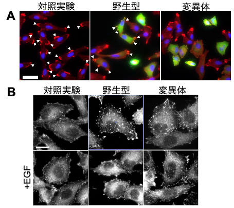 ①がん細胞が上皮成長因子(EGF)の方向に向かって運動する仕組みを明らかにしました。