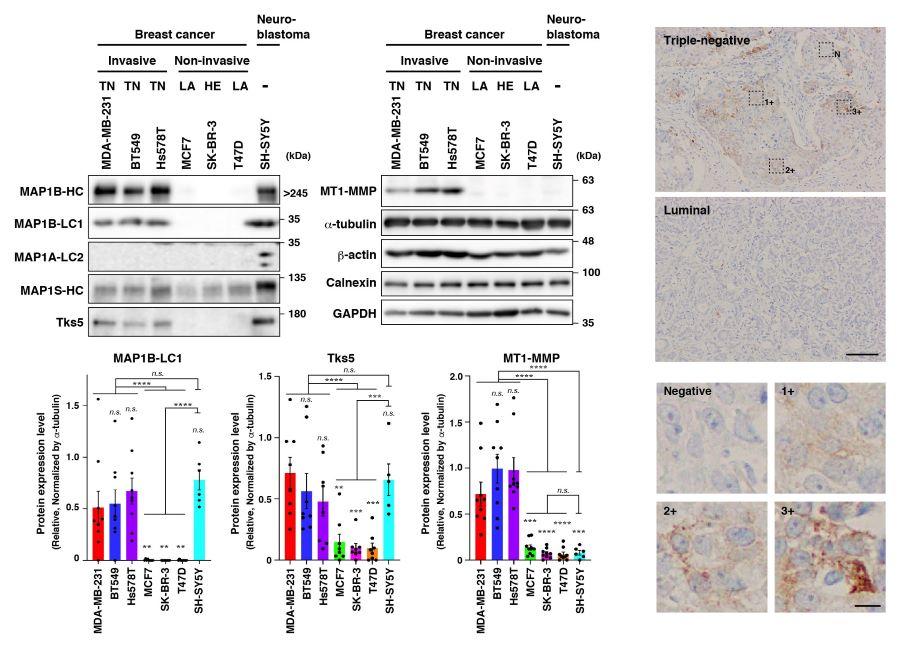 以上の結果から、MAP1Bは、TNBC細胞においてcortactinやTks5との相互作用を介して浸潤突起を正に制御しており、がんの浸潤転移を促進することが示唆されました。